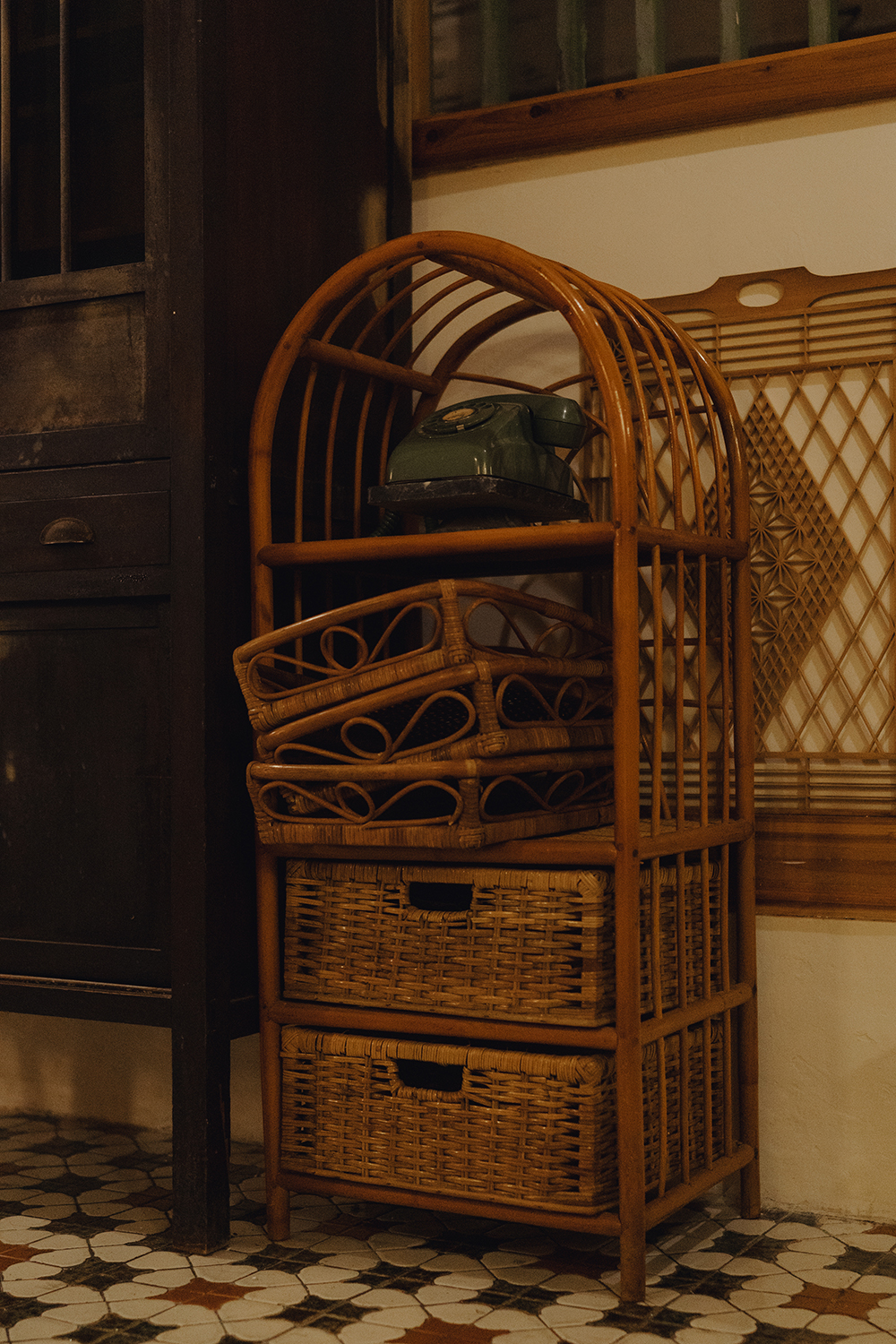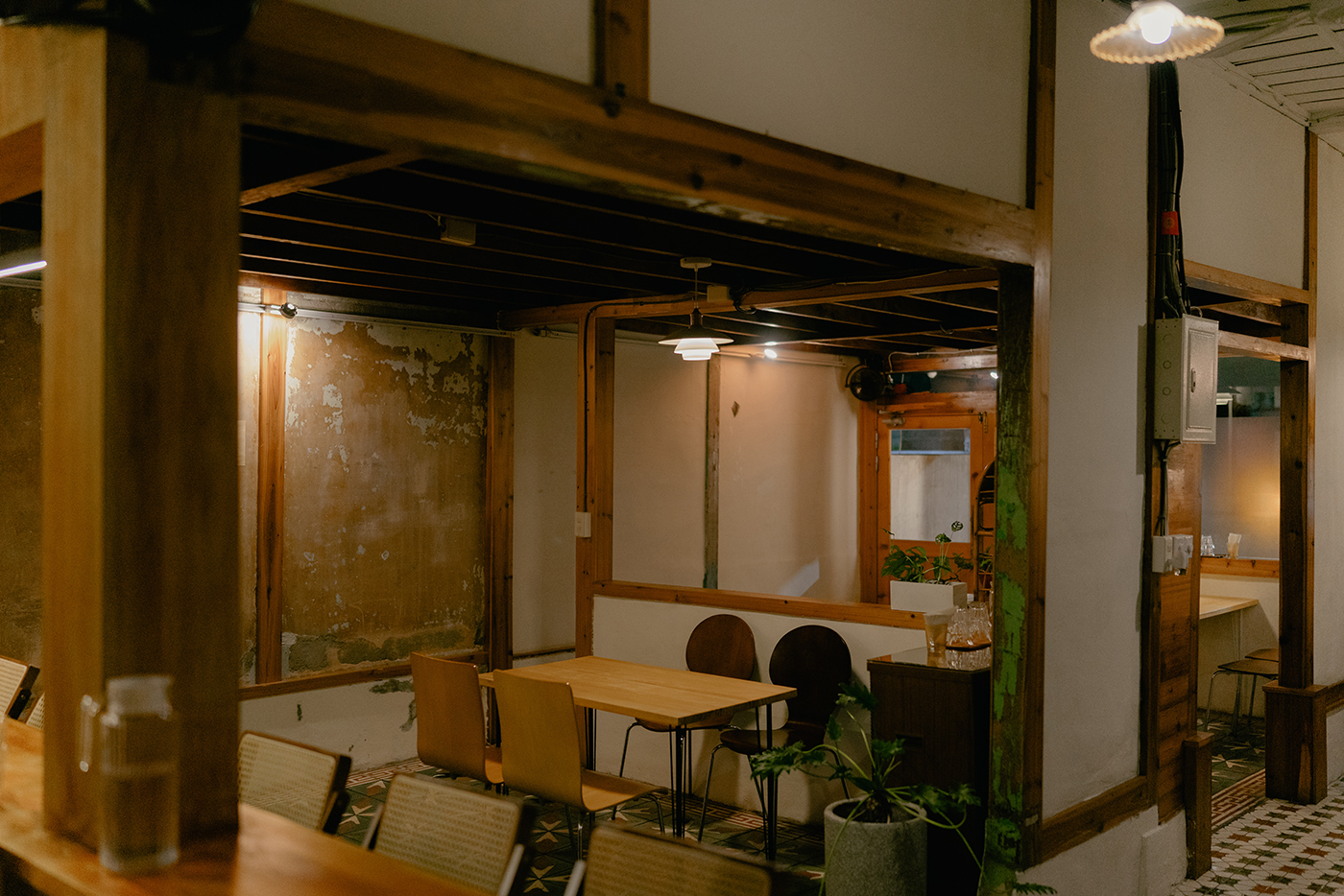 店外紅磚砌成的矮牆圍出一方天地,推門而入,檜木架起的老屋結構、花磚與磨石子交錯的台式地板、微微斑駁的牆面與被時間洗亮的木頭氣味逐一浮現,復古老件與現代家具自然地交錯。店內播放著 Lo-Fi 或輕快的 Pop 音樂,節奏自然而不喧嘩,沒有刻意賣弄懷舊,也不強調老宅氛圍,讓空間自然而然流露出屬於嘉義的緩慢性格,在這裡喝酒,是能讓人好好坐下、好好說話,無須言語也能安穩停留。