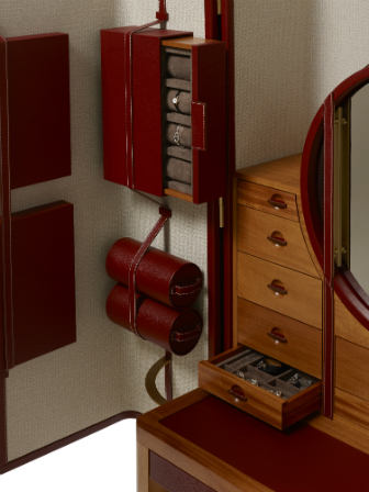 展覽中最引人目光的莫過於 The CURIOSITÉS 系列珠寶櫃,由桃花心木打造搭配沉穩的暗紅牛皮,不只能收納一百多件珠寶,側邊的皮質收納盒皆可拆卸作為旅行時使用,更可依個人需求客製化訂做。