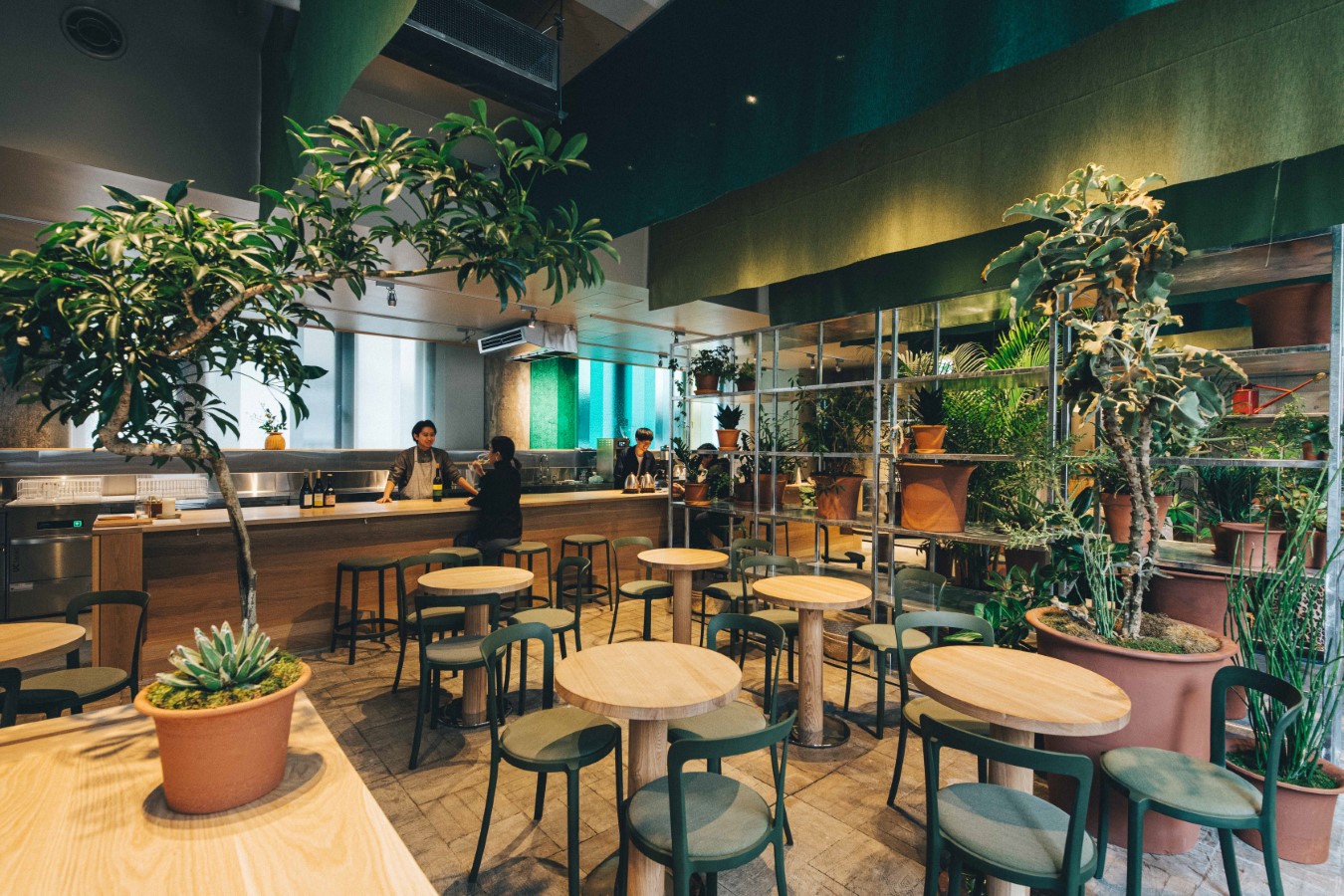 咖啡廳「SWITCH COFFEE」。一樓的Caveman、Wine bar、Switch Coffee 沒有定型的牆壁,且K5周遭環境缺乏綠意,讓CKR產生將空間以大量植栽化作「城市綠洲」靈感,含糊的邊界以植物分隔卻又聯貫著空間,帶來曖昧不明的效果。(Photo Credit: K5)