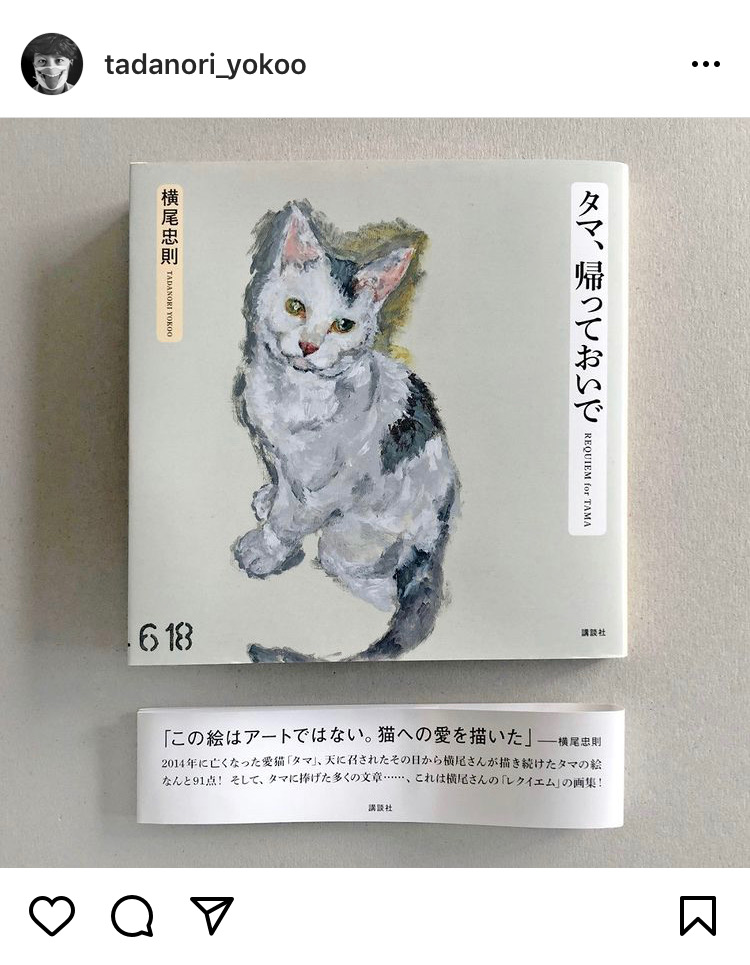 除此之外,橫尾忠則也依此系列作品推出一本《多摩回家》的圖文集,書中不僅收錄了91件作品,同時他本人也書寫了許多與Tama共同生活時的快樂回憶,以及失去後的孤獨感。因為對他來說,Tama是他的謬斯,是美好的化身,同時也代表著藝術家必須具備的所有性格。