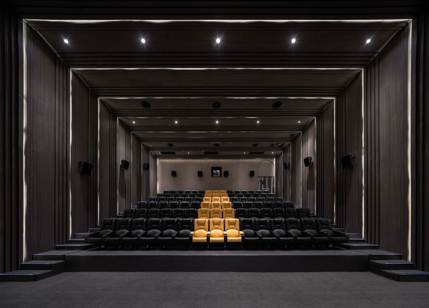 另外,通往影廳的長廊,一道道拱形的木件錯落在挑高 10 公尺的空間中,望向末端可以發現,設計師透過不同程度彎曲木頭,為短短的廊道帶來透視感。此處為分別通往電影院與書店的動線節點,上下分流的設計也讓觀影者與閱讀者能不相干擾,使性質不同的兩個空間在建築中共存。
