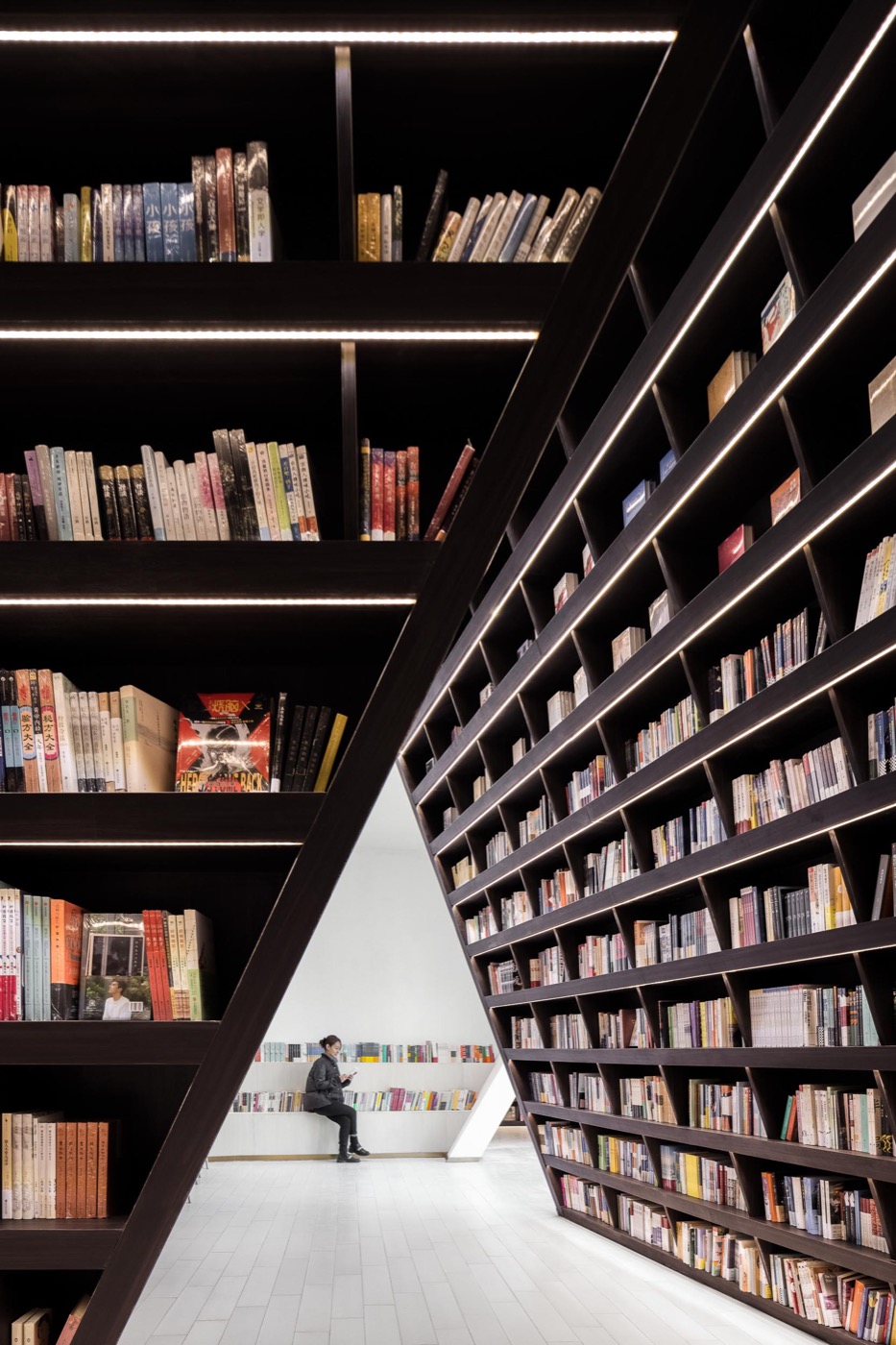 回顧第一間「鍾書閣」,位在上海泰晤士小鎮的總店內,牆面、玻璃地板下皆是書本,彷彿被包圍在書香之中;而被評為「全球十大最美書店」的揚州店,則將江蘇「橋樑」融入設計,勾勒出書架優美的弧線;都江堰店則將此地的山水、滂礡的水壩,化作高聳、氣宇軒昂的書架,地面鋪上黑色磁磚,彷彿水面映射著整個空間。