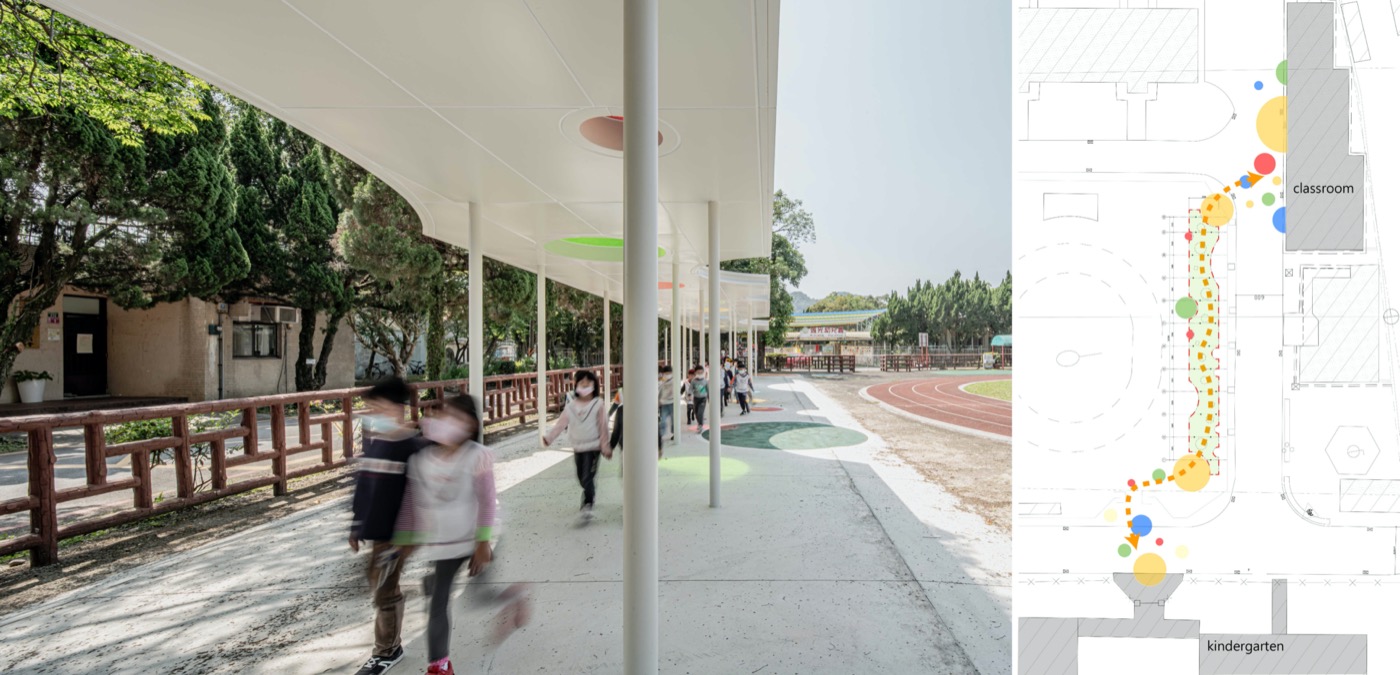 而戶外 30 公尺長的白色金屬棚架「風雨走廊」,則連接了新、舊幼兒園區。棚架屋頂因應樹木生長空間,在邊緣退讓出許多的半圓,並且在屋頂上頭開出大大小小的彩色圓洞,新、舊幼兒園間的地面也塗鴉著彩色圓形圖案,成為小朋友上課與遊樂的前進索引,帶領著他們安全通達教室。