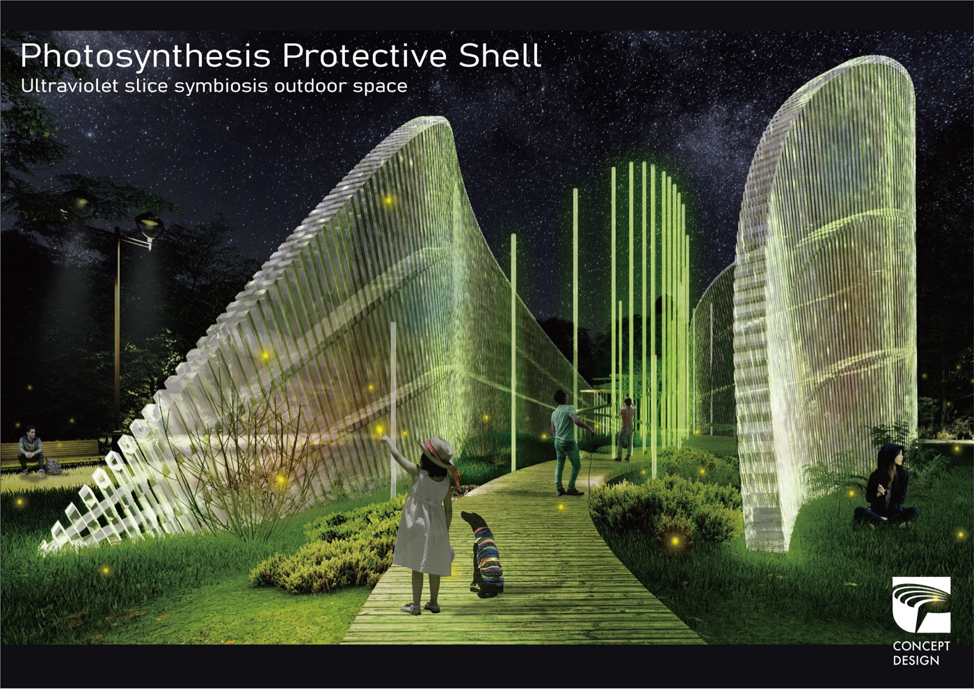 在空間設計類,台灣設計師孫筱瑜、陳建勳的「光合作用保護殼:紫外線之片利共生戶外空間」,以澳洲昆士蘭州的舒斯特公園為基地,針對當地紫外線照射強烈的問題,以採用太陽能及綠螢光蛋白的模組裝置,設計能滿足戶外休閒又抗紫外線的遮蔽空間,並可依紫外線指數增減如仿生花朵般開闔作用,紫外線強時為涼亭遮蔽,夜晚弱時則成自然發光的裝置藝術,頗具巧思。