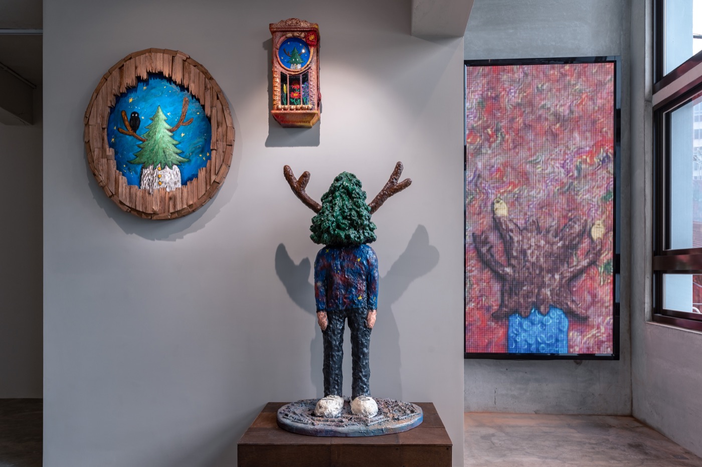 1樓展場中 220 公分巨型男孩⽊雕與 12 座⼤理⽯展台,形塑空間個性。(Photo Credit:伊日後樂園 BACK_Y)