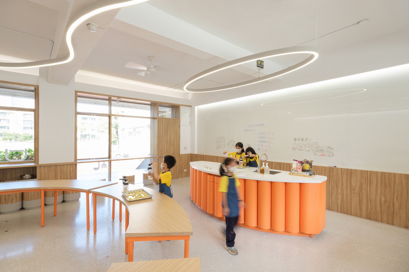 台中市忠孝國小原本的食農教室空間不大,師生上課時甚至需將課桌椅搬到走廊,牆邊的矮櫃也無法有效收納廚具及食材。