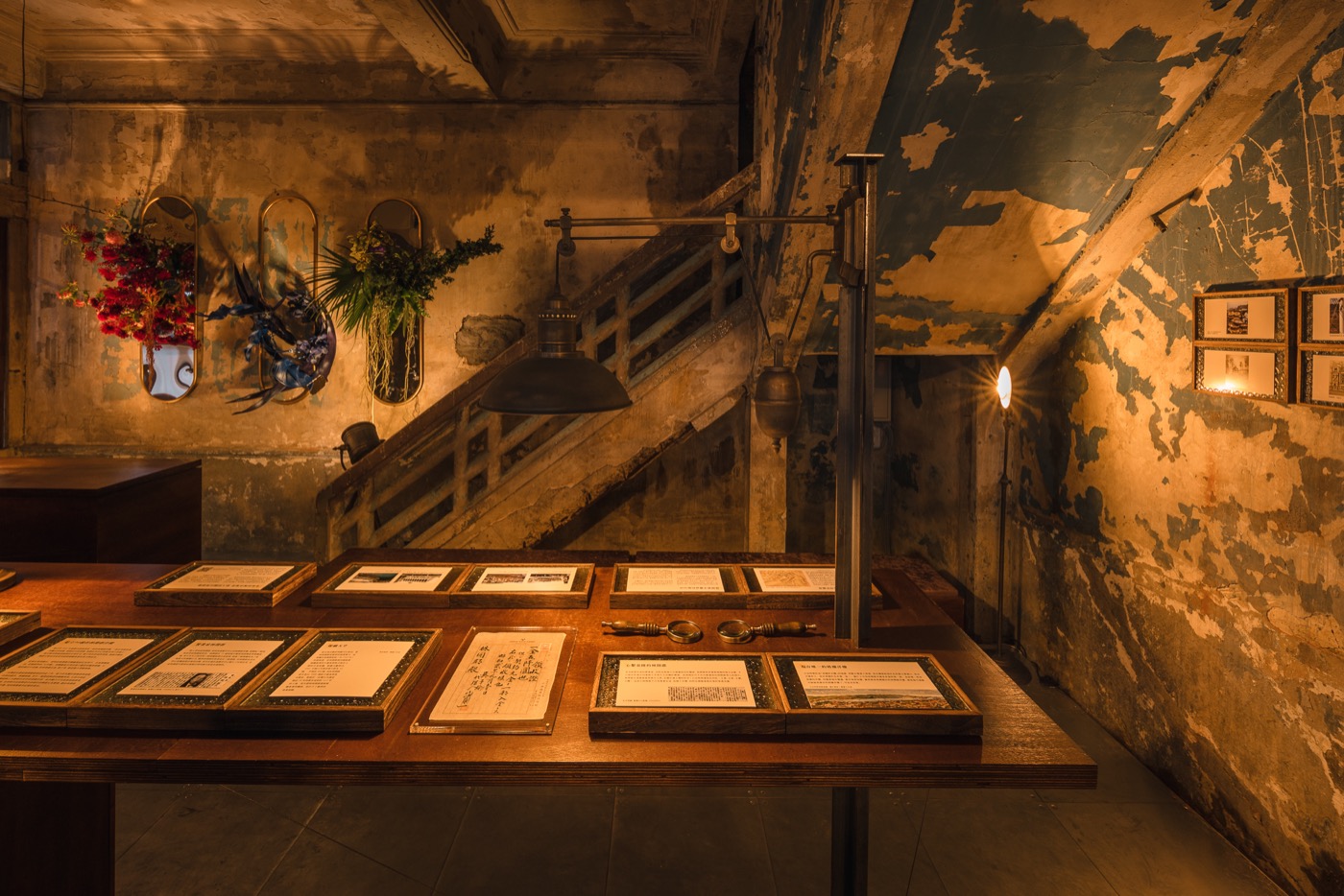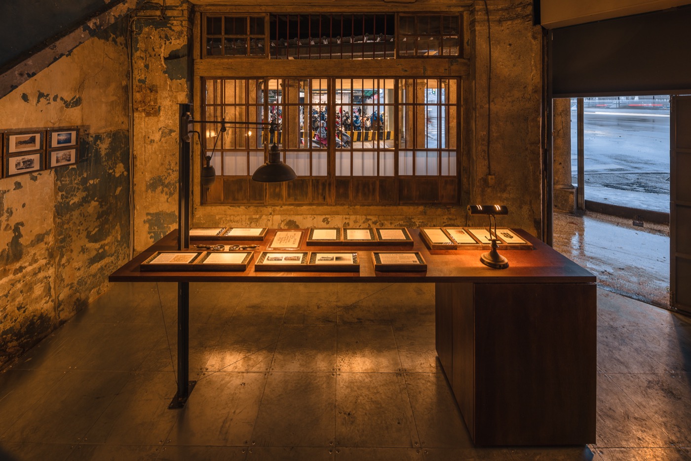 展覽空間設計由「無制設計」操刀,以呈現原貌為主軸,掃去沉積多年的灰塵後,盡可能保留原本的痕跡,更為了不傷害尚未修復的地板,使用模組化的鋁合金輕質混凝土架高地坪。此外,也特別邀來「瓦豆」選擇柔和的燈器,讓滄桑斑駁的空間在光暈之下也備感溫暖,「阿戴商號」則依照當年建築的氣質,在金色金屬框中為空間裝飾了三個摩登豔麗的花卉創作。在短短約兩個月的時間,一群團隊協力下讓原本破舊的空間重回生氣。
