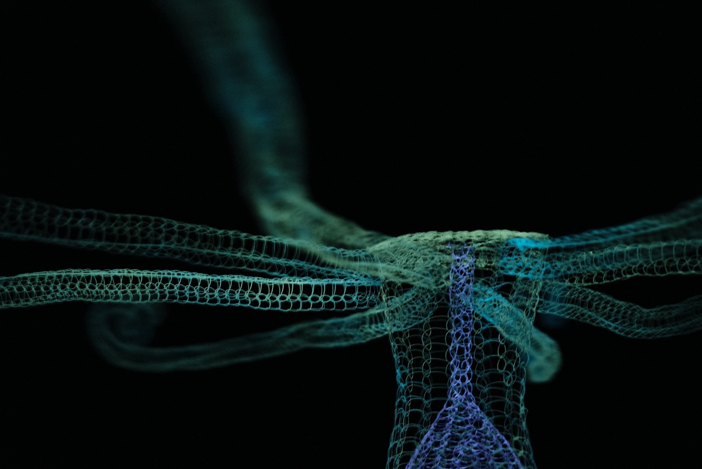 面對大海,Annie 選擇具有女性特質的編織工藝勾勒這些深海發光體,以鍍銀銅線為材料編織,並為它們噴上會吸收紫外線而發光的夜光漆。這些人們不熟悉的海底生物在空間中飄動、旋轉,並隨著夜光釋放,每一刻都在產生變化,令人在進入畫廊的瞬間彷彿潛入深海裡。