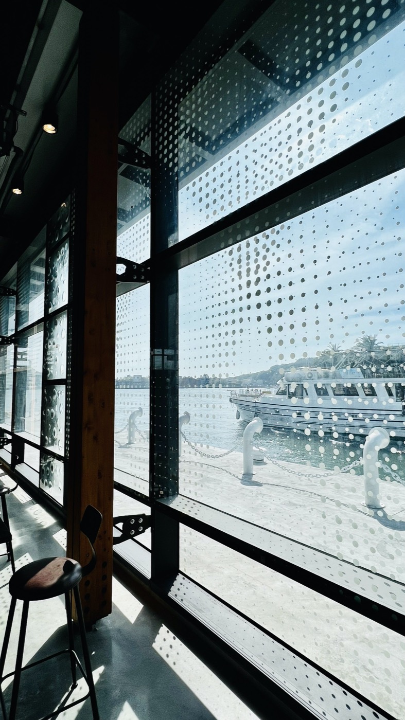 因此建物在「透明盒子」概念下,使用透光材料作為新立面,營造室內明亮感。藉由「窯燒玻璃」營造水的泡泡感,以及「雙層噴砂玻璃牆」的網點設計部分過濾陽光,中間的空氣層則可隔熱,兼具節能效果。此設計讓白天由內往外看海時,增添別樣感受;夜晚則似港邊燈塔,透出溫暖微光。