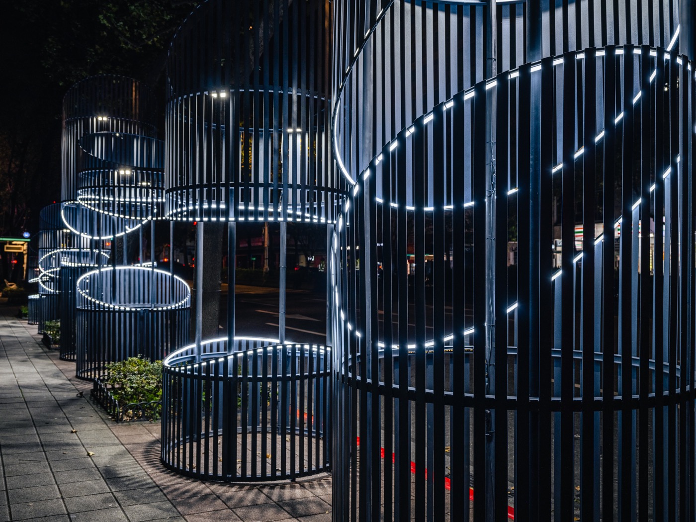黑川互動媒體所創作的「城市光點 pixel corner」,以 12 個長形結構勾勒出視覺焦點,透過彼此在畫面上的連續性,討論光與數據、建築空間之間的互動演譯,創造與行人交會貼近的音像表演藝術。