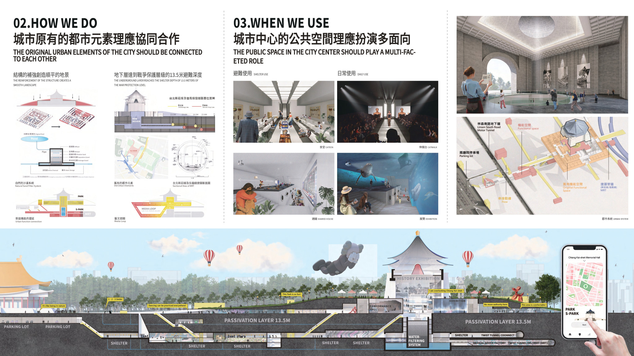 地層下,則從增加國民安全意識出發,希望在城市中心創造系統性的避難、醫療後備機制。創造連通現有的捷運路網及地下停車場的廊道,平時可作為藝文與休閒空間,災害發生時則使都市避難更具韌性。地下更結合了原有池塘與沙濾系統,形成自給自足的生態親水系統,希望具備公園飲水、緊急避難用水功能。