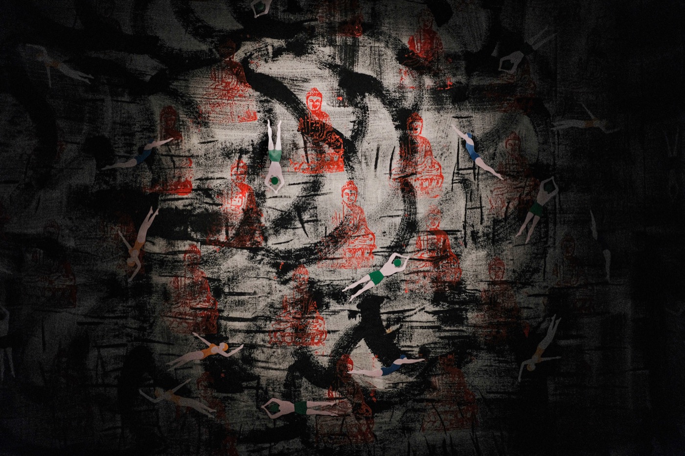 酒足之後,別忘了到樓下「苦海書寫」。阿光曾在無數深夜穿梭蘇花公路往返台北—花蓮兩地,多年前以眼前一片黑暗、車燈微亮的隧道場景,創作了十餘件長達 6 公尺的布幔畫作,如今作為突破一種,他以原畫重新創作《無邊際苦海》,將路徑連結人的過去、現在、未來,從羊水到世界的苦海中載浮載沉,邀請人們思考、並寫下今天喝下這杯酒水的意義,你背後隱含的慾望是什麼呢?