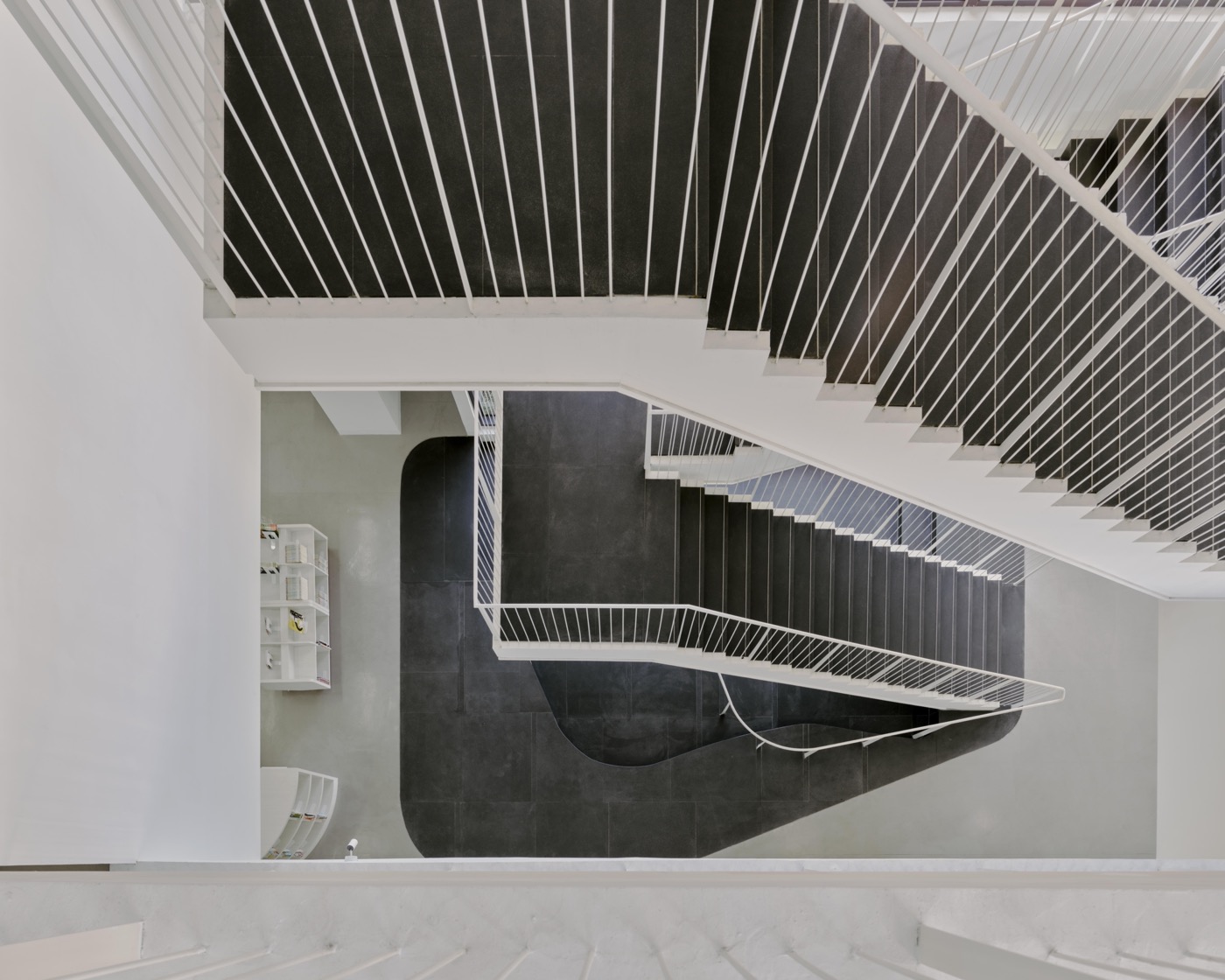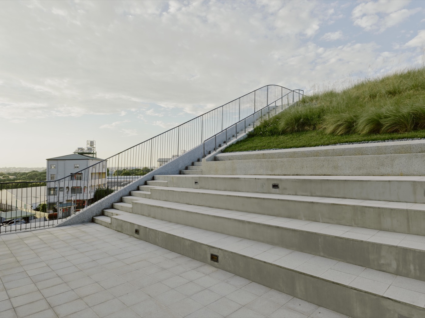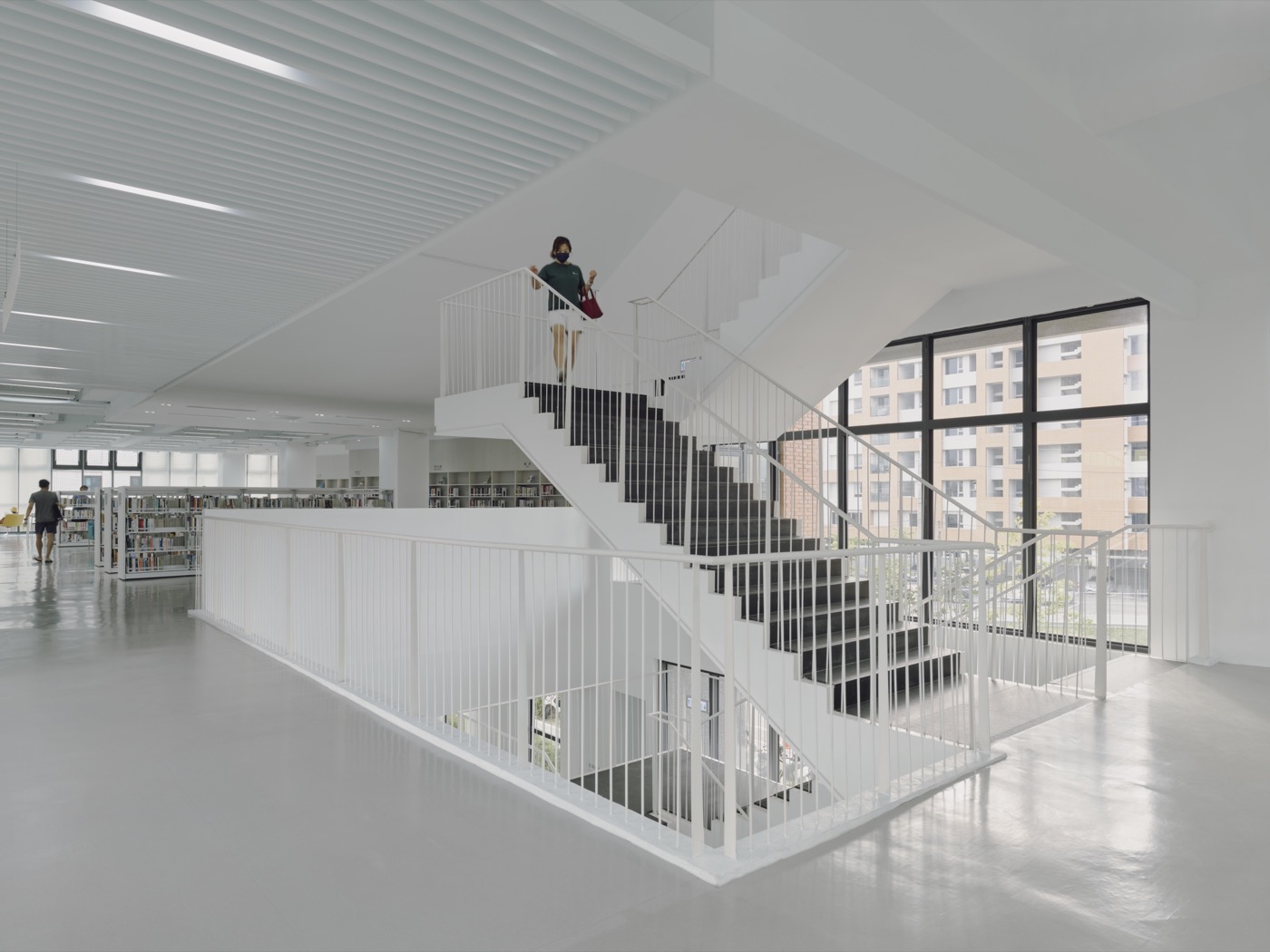 「借還書櫃檯及後場空間」則置中於圖書館以便於管理和服務。櫃檯前方,向上延伸出的大挑空,以簡約、輕盈的懸臂鋼梯串聯各樓層閱讀空間,將戶外漫遊的輕鬆體驗延續到室內,讓建築與環境不因室內外的區隔而絕然分裂,而挑空設計也是物理性自然排熱的通風路徑。