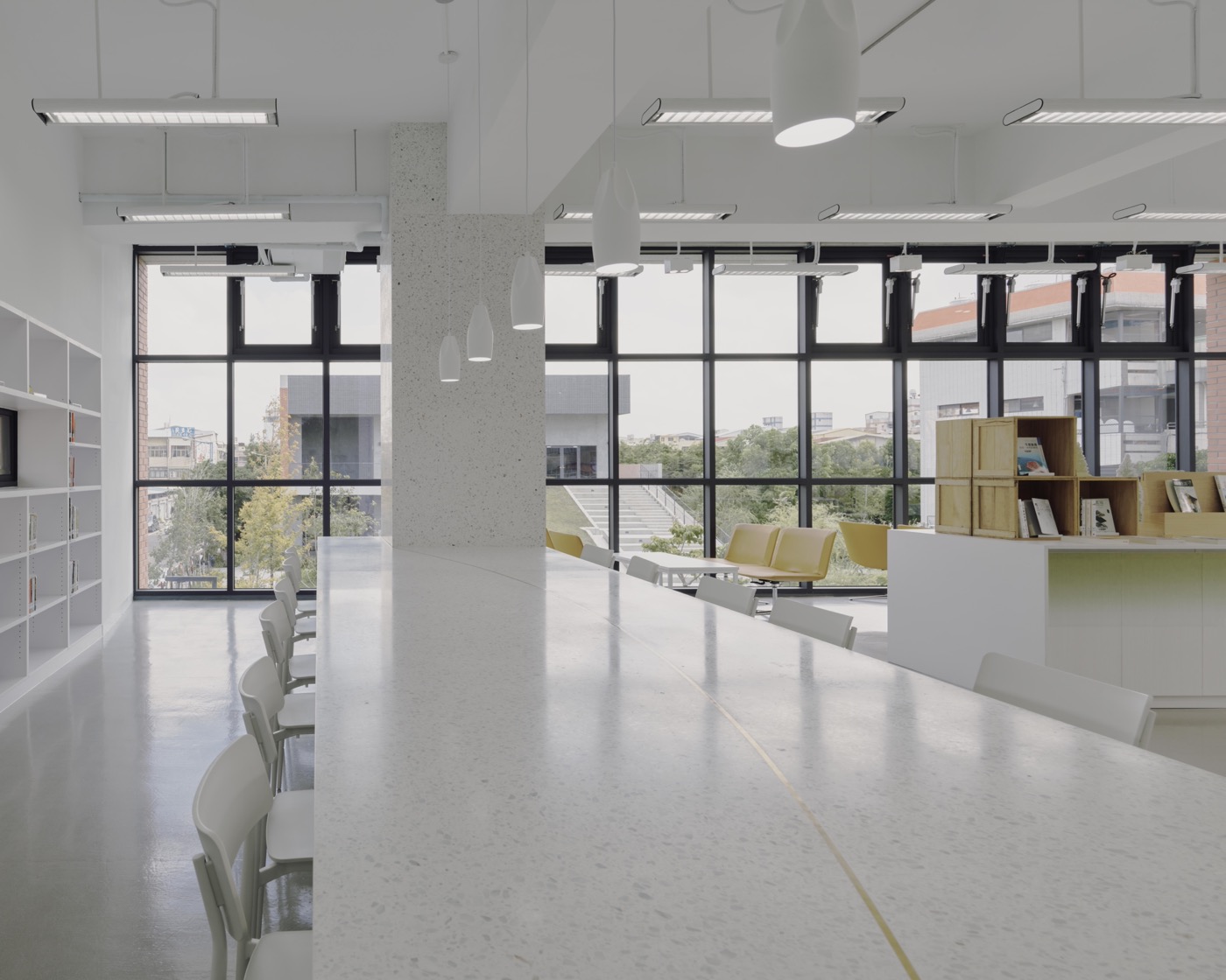 來到二樓,大面落地窗旁的「光合閱讀區」,提供讀者一襲能俯視中央景觀廣場的閱讀環境,以環境為主題的藏書與展覽,讓人們於理性與感性的氛圍中,重新思索關於環境永續的議題;一旁的白色磨石大長桌,則可以作為舉辦輕型主題討論的活動空間。挑空的另一側則是「一般開架閱覽及專注閱讀區」,不同的家具座椅配置,也為閱讀帶來更多元的方式。