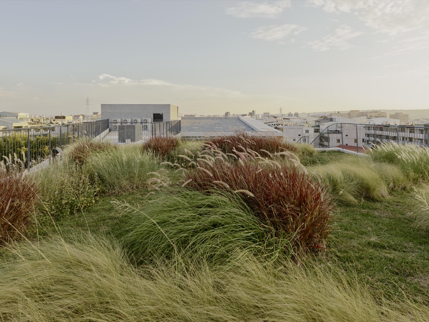 「多功能教室」及「青少年閱讀區」通常較為吵鬧,配置上將其置於頂樓,與下方的一般閱讀區稍作區隔。青少年閱讀區也是圖書館動線的最末端,這裡屋頂緩緩升起讓出 了天窗,南向陽光隨時間的推移注滿空間,午後的夕陽藉由紅磚的映射,使白牆暈染一抹奇幻的淡淡紅色。落地窗的另一邊,還有延伸至天際的「閱讀草坡」,大肚山的芒草翩翩搖曳,熱情的招呼著大家踏出室內,走向探索新知的另一篇章。