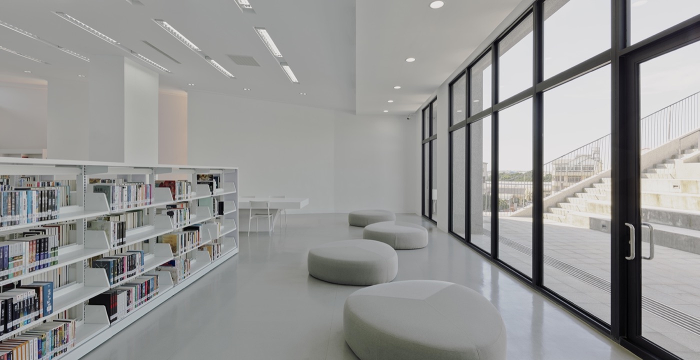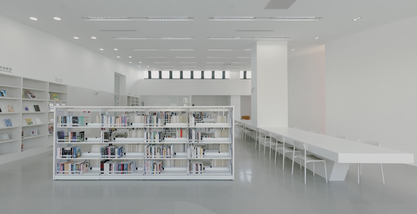 建築團隊在室內運用簡約低調的質感,堆砌出沉靜、專注的空間,也加強了對建築外環境的感受度,他們希望,「讓使用者可以安靜聆聽圖書館自身的豐富空間及環境,深刻感受到書本的重量、自然光線的變化、建築材料的觸感及外面豐富蓬勃的生態環境。」