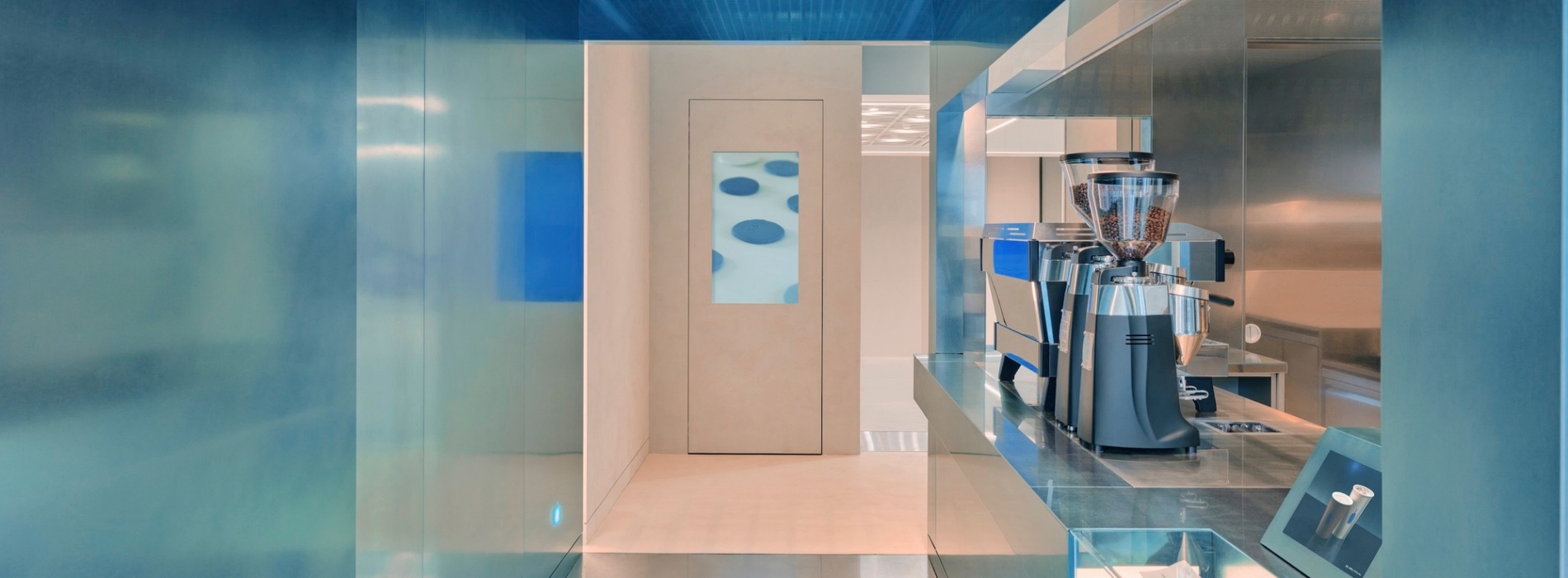創立至今逾 20 年的藍瓶咖啡(Blue Bottle Coffee),於 2019 年正式進軍首爾聖水洞,開設首間韓國分店,逐步拓展至三清洞、光化門、汝矣島、狎鷗亭等地,最新的第 9 間分店為 2022 年 12 月開幕的首爾明洞店,由擅長融合現代設計與韓國傳統建築之美的設計團隊 Teo Yang Studio 操刀,遠看彷彿一座白色盒子的「藍屋」(Blue House)散發柔和藍光,加上室內金屬冷色調性看似未來感十足,實則細膩地縫合當地傳統建築設計的哲思與工藝。