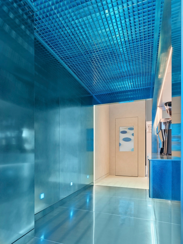 最引人注目的,莫過於暗啞低調光澤的不鏽鋼材質吧台與陳列空間,以及回應太空時代設計風格所採用間接照明,淡藍色LED光芒與特製格柵金屬天花板,彼此交織出既溫柔又冷調的前衛風格。