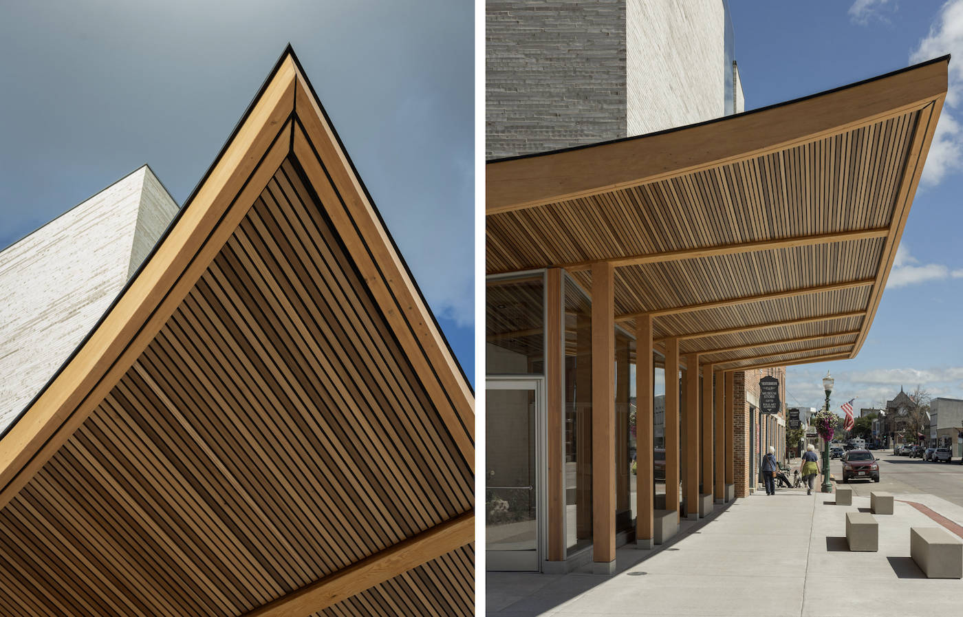 入口處屋簷呈水平型態的彎曲風帆狀木質結構,Snøhetta選用道格拉斯冷杉製作。(Photo Credit:Snøhetta、Photography by Michael Grimm)