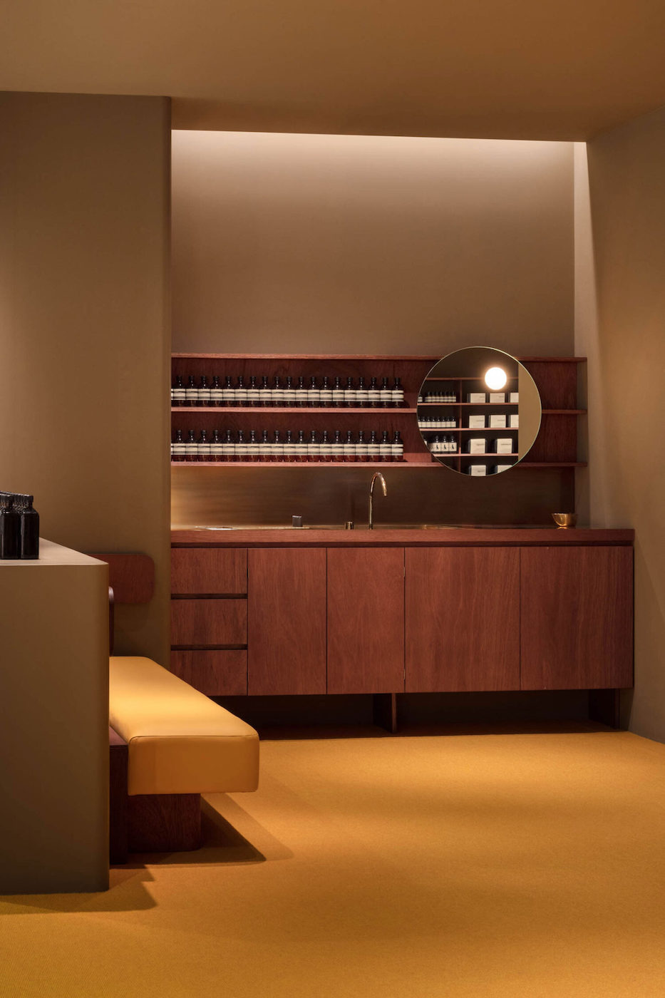 此外,店內多處運用散發溫暖魅力的圓角設計,例如:柱子與牆壁之間的圓角、中央水槽側面的弧形、長凳四角、水槽圓鏡,以及提供香水體驗服務的 Infusion Chamber 中半圓形壁龕,這些有機曲線賦予空間更為柔和、安全的逛遊印象。