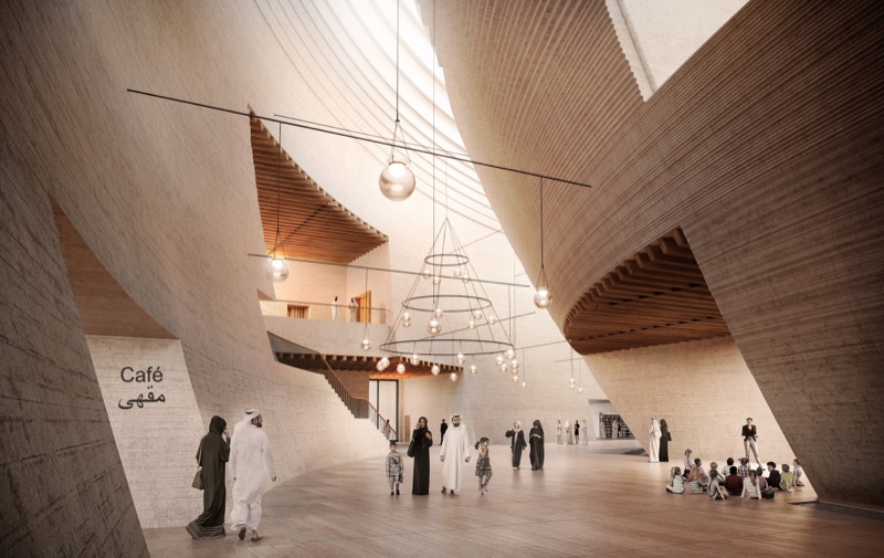 建築體除了主要的粗糙混凝土,更採用了拋光灰泥、反光金屬、木材、陶瓷磚和紡織品等與混凝土形成對比的材料,以明確劃分出樓梯間、祈禱室、圖書室、大廳等不同功能的區域。建造過程將密切與當地的建築工匠合作,確保宛如從土中長出的「在地性」,也落實博物館文化交流和工藝傳承的功能。