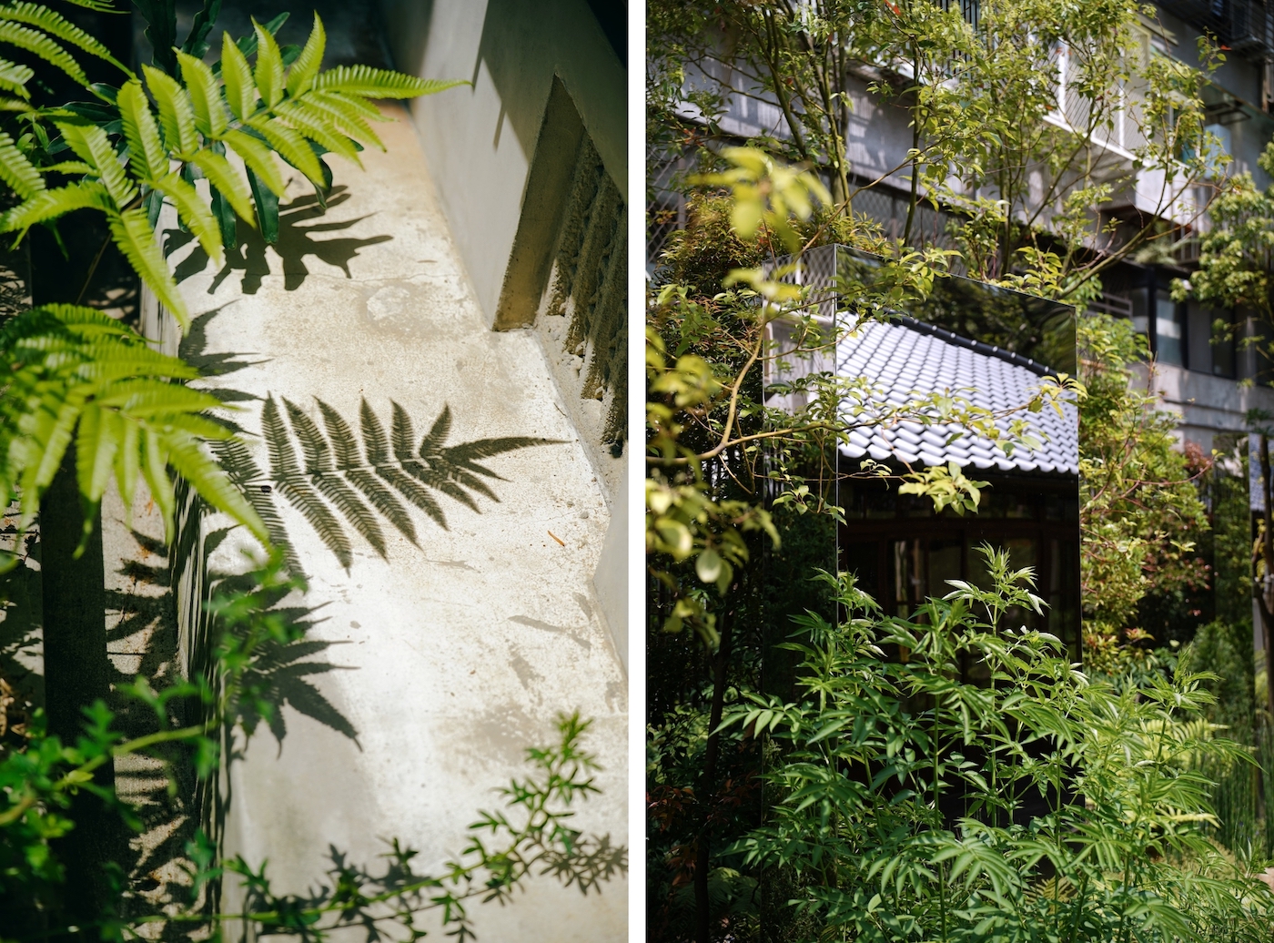 在林木植栽之間,有三件淺淺的不鏽鋼鏡面藝術裝置,是格子認為十分有趣的隱形設計,「日式建築存在著模矩秩序,透過不鏽鋼鏡面,你會發現空間原有阻隔產生新變化。」透過鏡面,不僅讓人影、光影化為場景的一部分,站在緣側無法完整看盡建築立面的可惜之處,也透過鏡面補充視線;另一個設計細節為不鏽鋼鏡面長寬是依據日式建築門扇等比放大,也與老屋產生隱約的關聯。