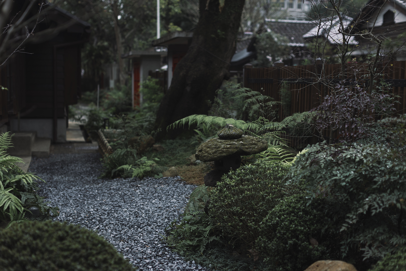 與鄰里建築距離相近的 B 棟、C 棟旁充滿山嵐霧氣的「次森林」彷彿一片自然屏障,樹園藝共同創辦人陳妍卉分享,「我們針對日式老建築而選定了樟樹,一是台灣樟腦出口曾經躍居世界第一,二是樟樹冬日不太落葉,避免落葉太多覆蓋土壤。同時搭配不少來自林業保育署的自然倒木,全部從苗栗南庄扛過來,同時大量覆土後種植馬醉木、傅氏鳳尾蕨、金狗毛蕨、接骨木等約十種台灣原生種與四季開花性植物,經過三個月時間復育生長,現在已經有很多蝴蝶飛舞。」