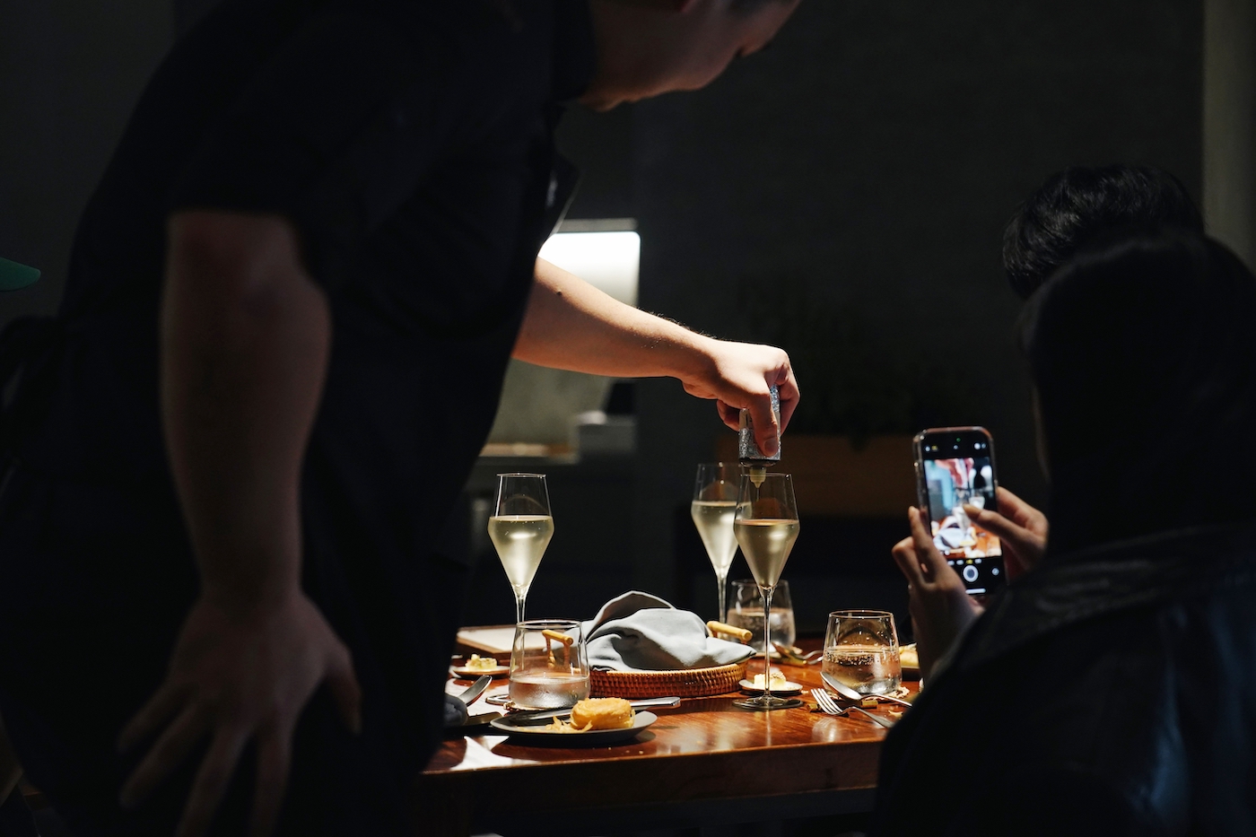 主廚江曜宇的同窗侍酒師 Aaron 加入後,在扎實細膩、彈性客製的餐酒搭配之下,酒精與無酒精 Pairing 成為值得體驗的耀眼環節,為用餐體驗加值;侍酒師 Aaron 針對料理研發 4 款環環相扣的無酒精調飲,酒精則有葡萄酒、清酒等選擇,由於採行無固定酒單方式,考驗侍酒師對酒款的理解深度、搭配想像,以及對顧客的觀察力與靈機應變等。
