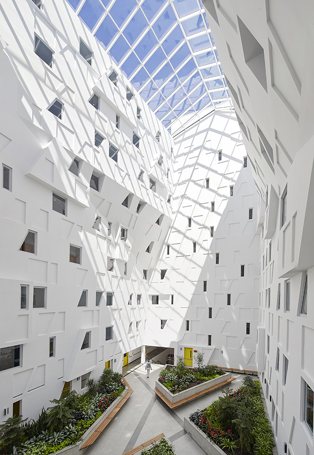 建築設計呈現動態又合理的幾何形狀,Studio Libeskind以其獨特的設計語彙打造大膽的斜立面外觀,一種折疊形式打破了街道層面的體積,多個開窗設計也與周遭社區產生流通而開放的連接,創造住戶與周圍環境的積極互動;不論是套房型或一房型單元皆有寬敞的布局和提供足夠採光的大窗戶,建築中央更設有挑高庭院,使開放而穩固的元素融於整體形式中。