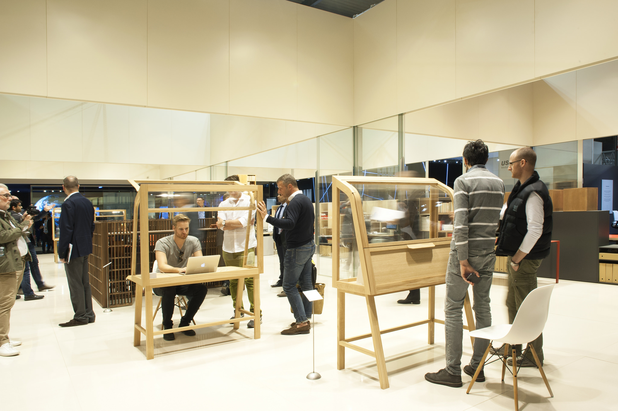 在「Free Man」的主題空間中,規劃了許多工作型態的展覽裝置,包括各式獨立的辦公空間,或小團體的工作區域等等,讓 MOT/TIMES 在看展之餘,也順勢坐下來工作一番,儼然整個展場都是小編的辦公室。(Photo credit:MOT/TIMES、Salone del Mobile)