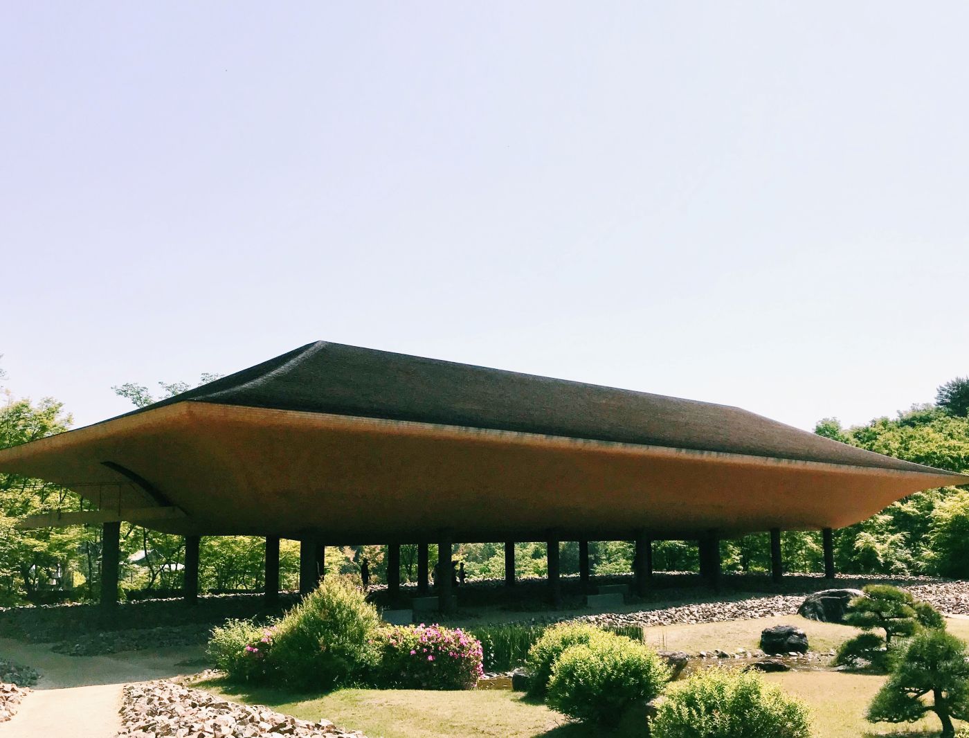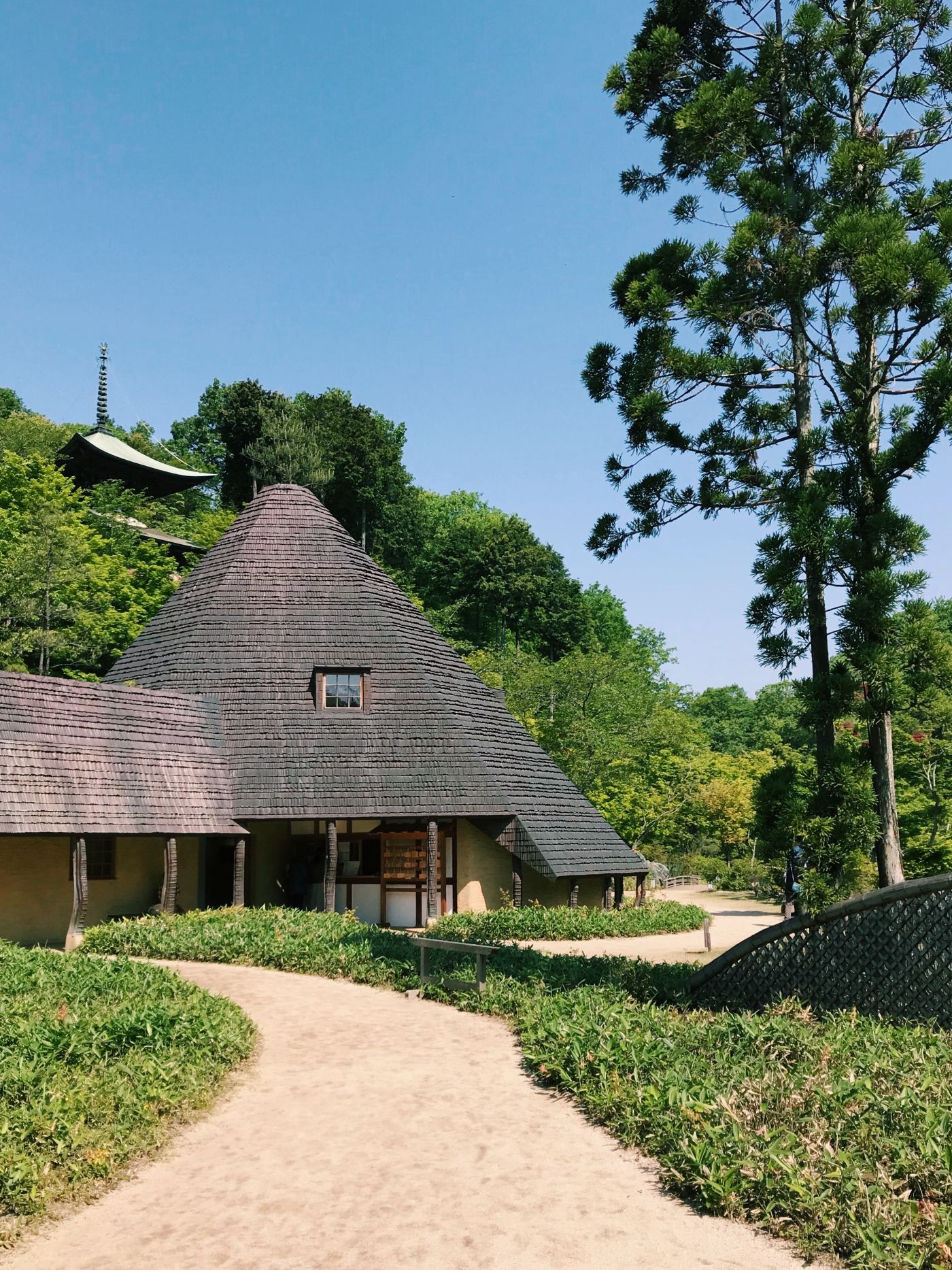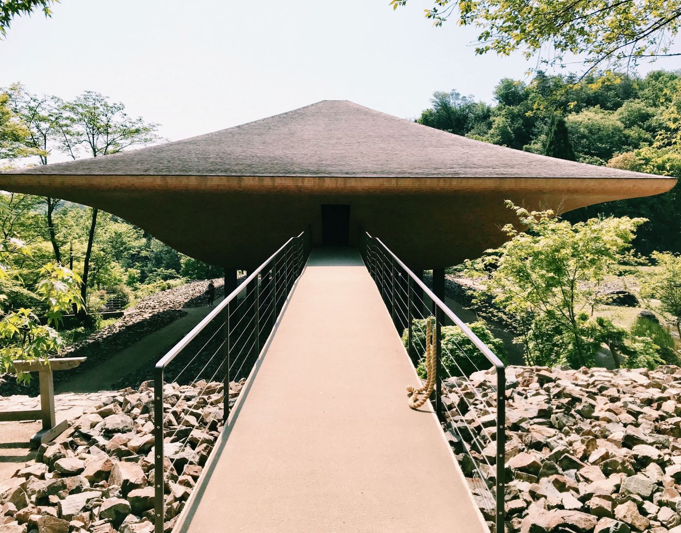 藤森照信設計的「松堂」,作為神勝寺的寺務室使用,販售著門票也展示著神勝寺的故事。充滿手感的有機型態的造型,彷彿身在宮崎駿世界的建築物,是藤森照信作品的最大特色,「松堂」也是一樣,像是泥土捏成的量體上罩著三角形的大屋頂,銅片一層一層隨性又整齊的貼附著。經常可以看見藤森照信在建築的屋頂上種植物,「松堂」也是一樣,屋頂上像是自我介紹般,種了顆小松。