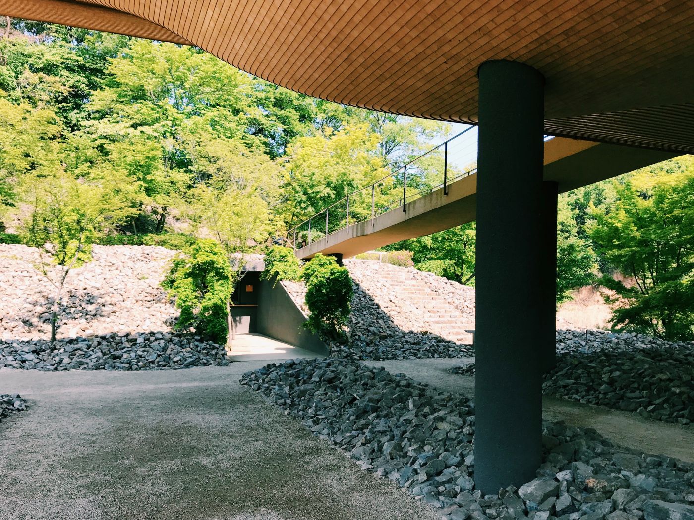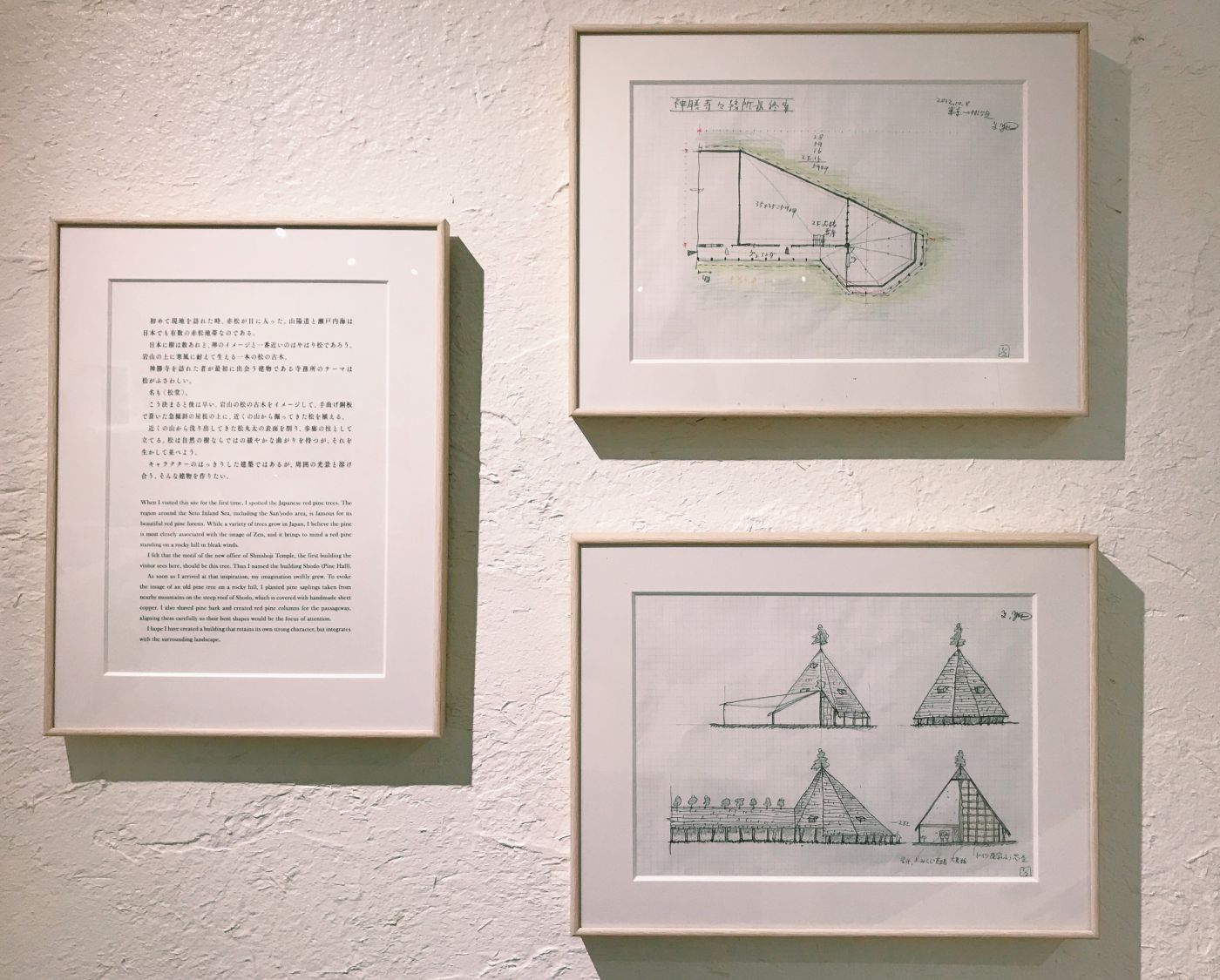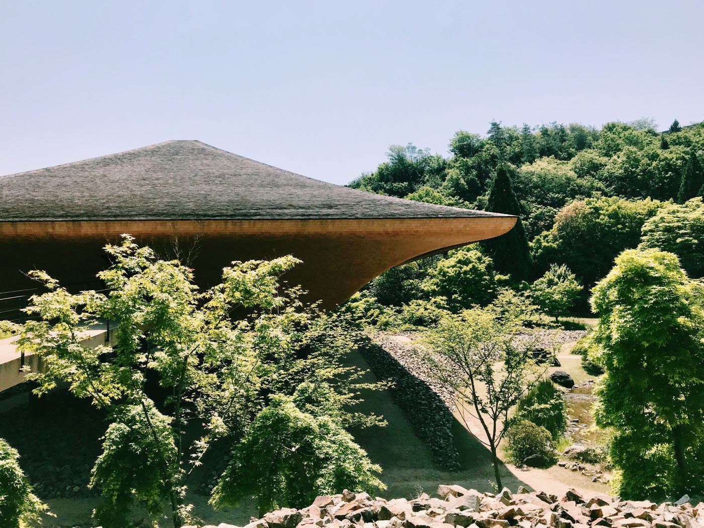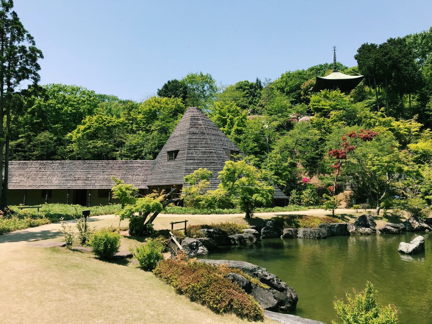 藤森照信設計的「松堂」,作為神勝寺的寺務室使用,販售著門票也展示著神勝寺的故事。充滿手感的有機型態的造型,彷彿身在宮崎駿世界的建築物,是藤森照信作品的最大特色,「松堂」也是一樣,像是泥土捏成的量體上罩著三角形的大屋頂,銅片一層一層隨性又整齊的貼附著。經常可以看見藤森照信在建築的屋頂上種植物,「松堂」也是一樣,屋頂上像是自我介紹般,種了顆小松。