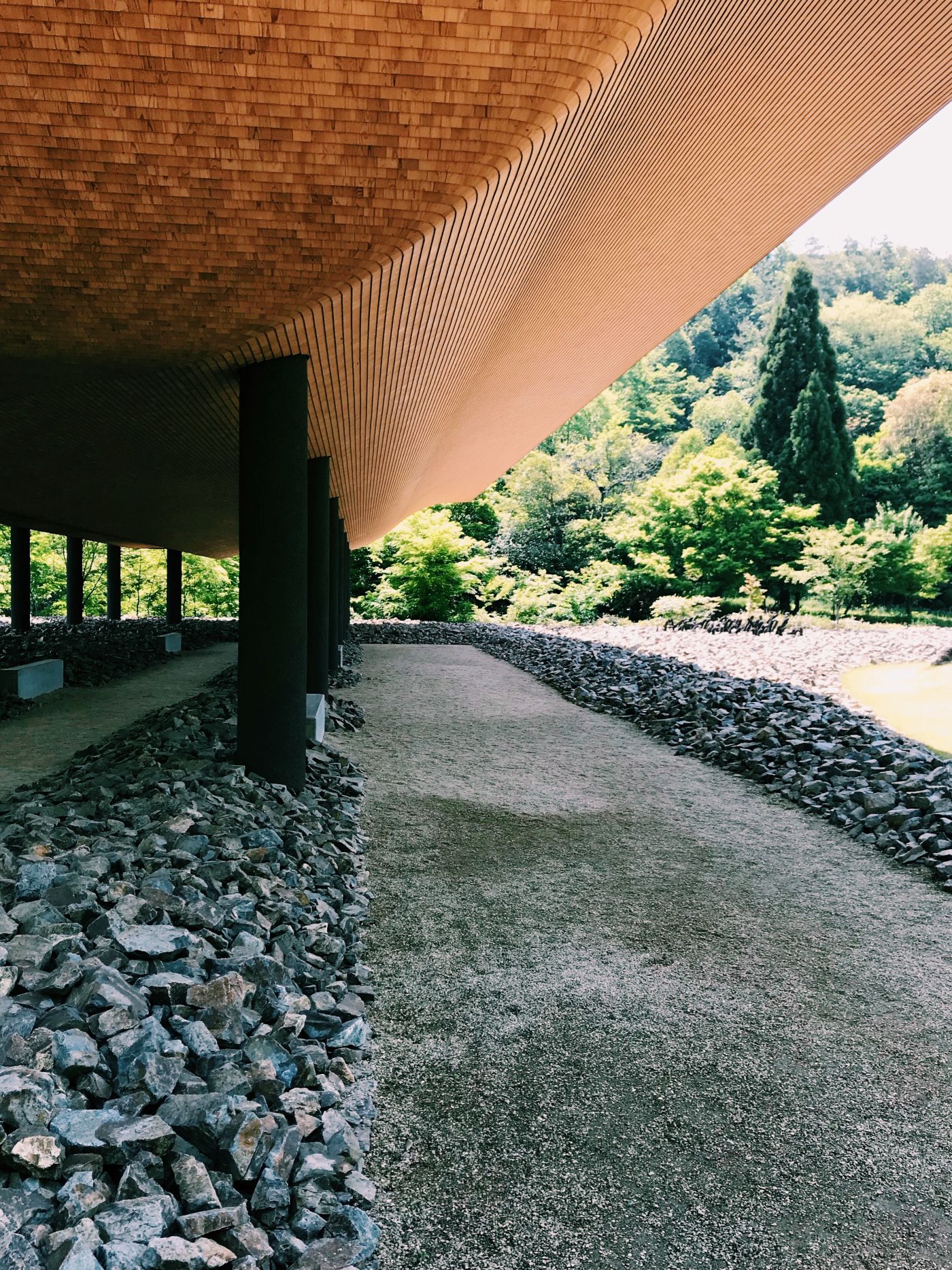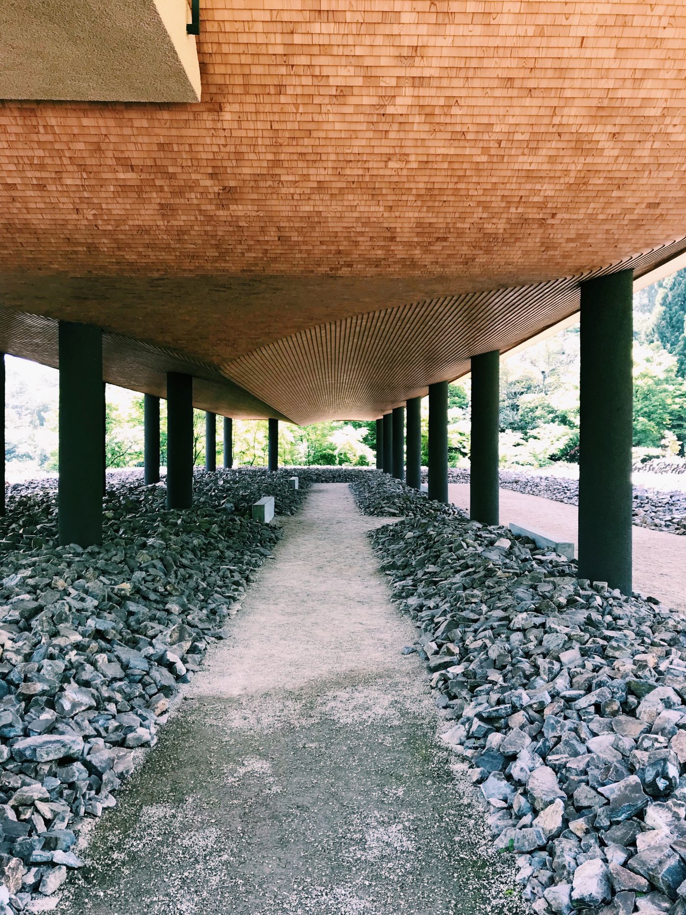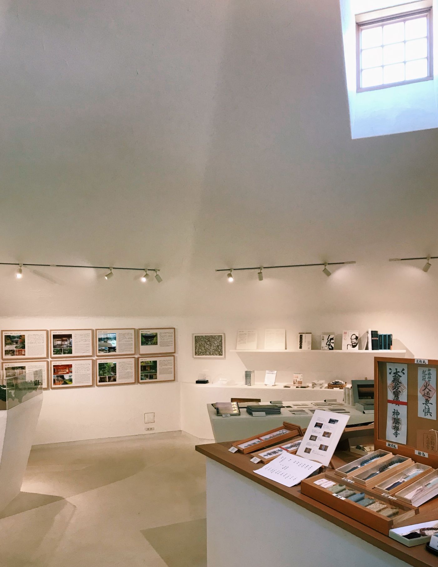 三角形屋頂內是白色的挑空大空間,屋頂上的小窗引入陽光,挑高的天花讓狹小的空間沒有壓迫,反而營造出像是洞窟般的氛圍,牆上掛著神勝寺的歷史,擺著一些禪學的書籍,還有建築師們的作品集與些許的手繪。戶外廊道旁並列的柱子是樹幹原有的彎曲姿,有機的線條環繞著,是如此的親切可愛。
