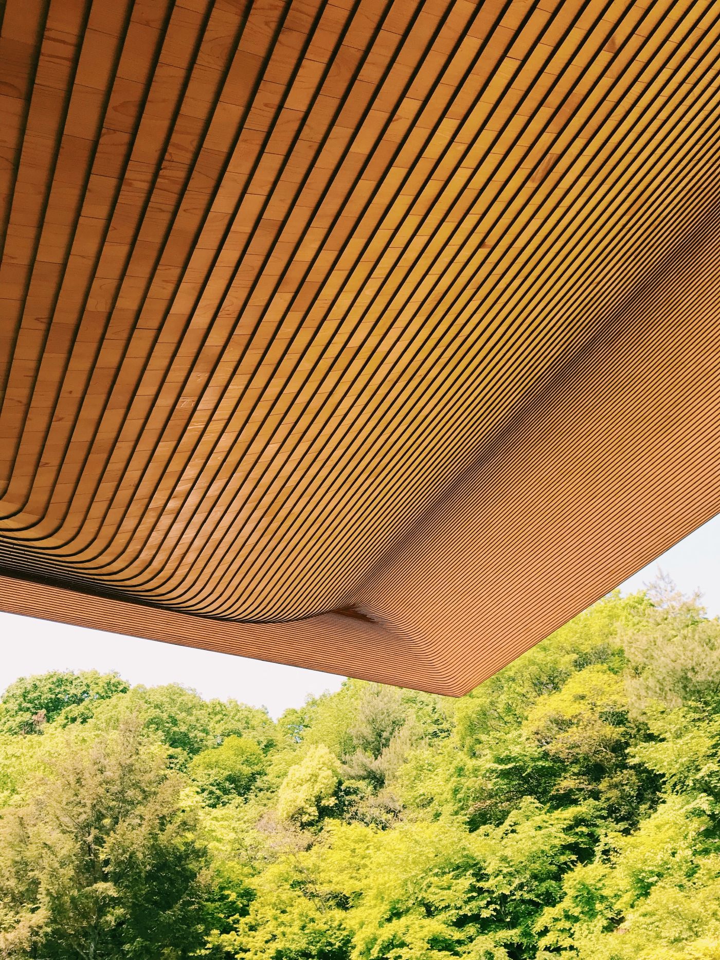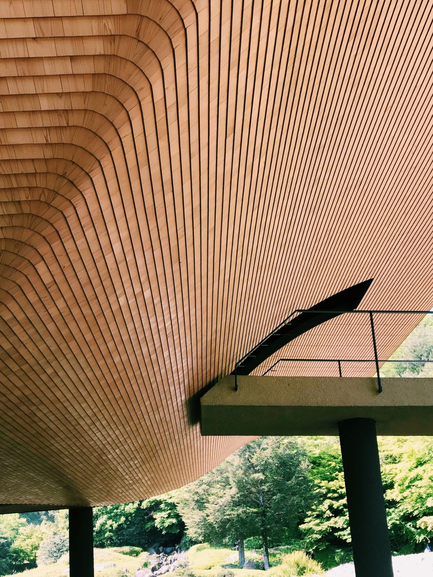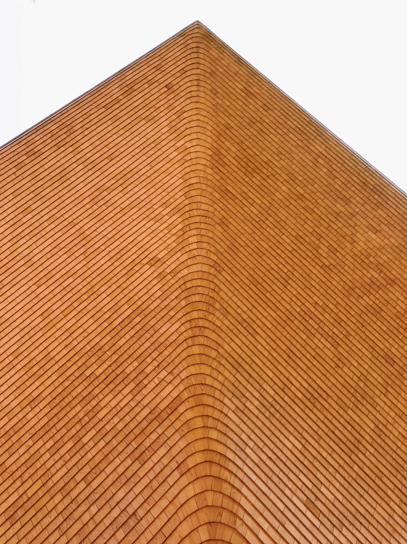 真正的「洸庭」是一座被椹木片包覆著的建築物,一片一片的椹木片以日本傳統屋頂鋪設工法*杮葺(こけらぶき)柔軟的貼附著,每一片都來自職人們耐心仔細地,沿著屋頂的弧線調整、修飾,貼付出的美麗紋路,與周邊的自然景色溫雅融合著。
