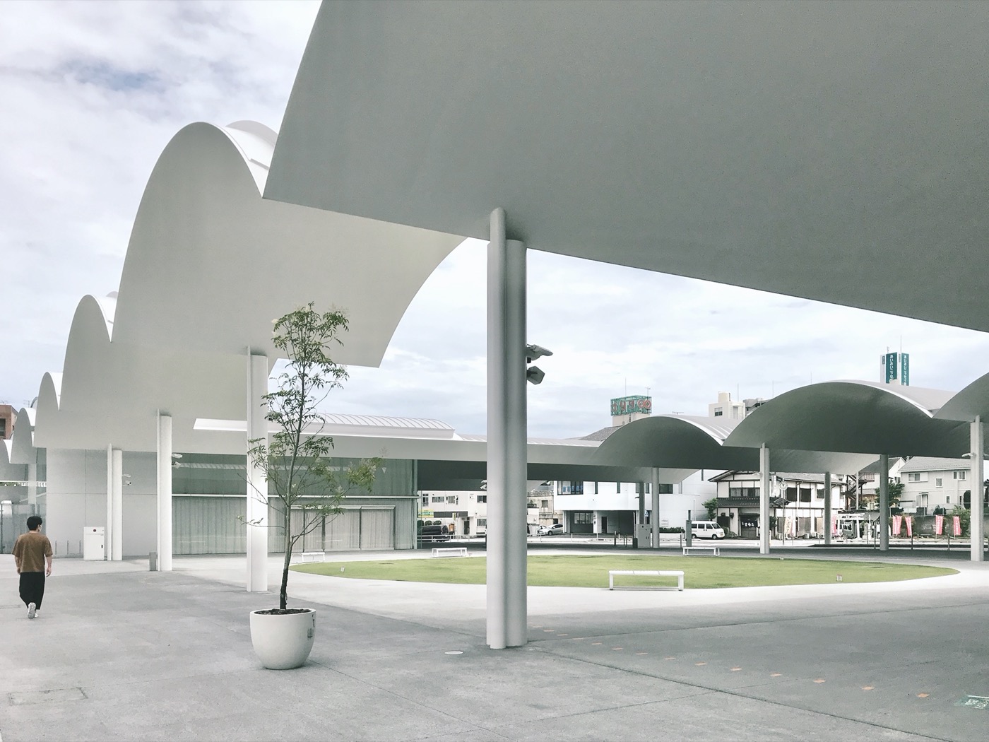 大廣場主要目的除了平常舉辦城鎮活動、居民聚集、停等市區公車等功能以外,更是個在未知災害來臨時,讓人們可以有個避難歇息的場所。正準備離開時,看見主棟大廳的玻璃窗上反射著平滑弧形屋頂上的肋板結構,與整個空間一樣,被整理的潔白乾淨、整齊劃一,這些肋板所構成的弧形屋頂所創造出來的空間效果、光影深淺,讓這個普通的廣場變得處處是風景。