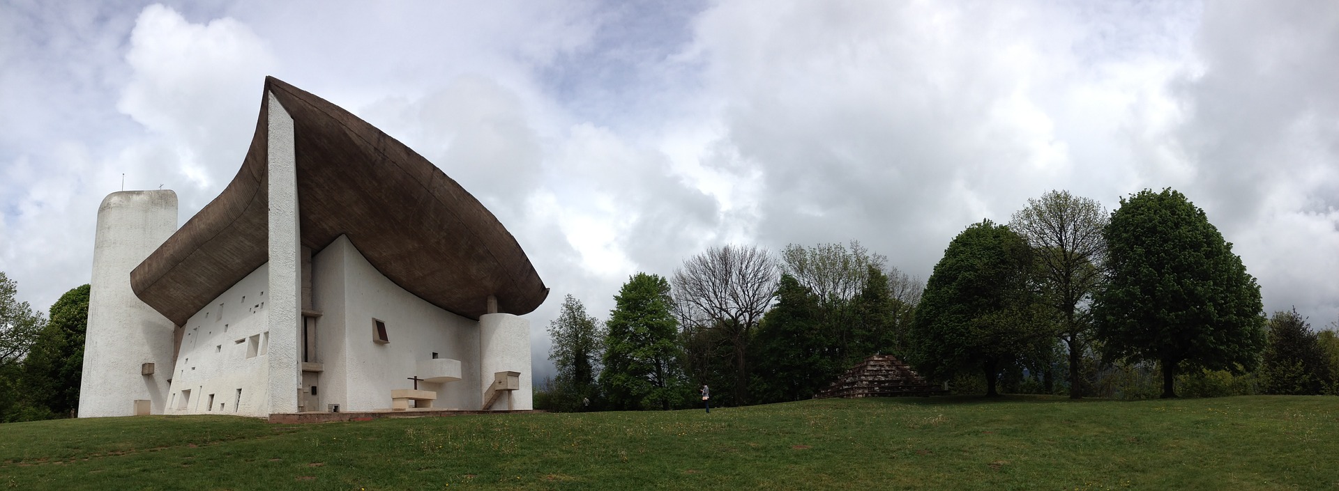 再者如柯比意的「廊香教堂」,「他很理性的表現比例的關係,又很感性的表現空間感、神聖的精神」龔老師說,建築牆面配置與開窗方式,隨著太陽位移時的光影流動,帶出室內充滿神性與戲劇張力的視覺印象,裡頭同時結合了古典建築「光」的神聖感、立體派的幾何雕塑感、蒙德里安的色彩。