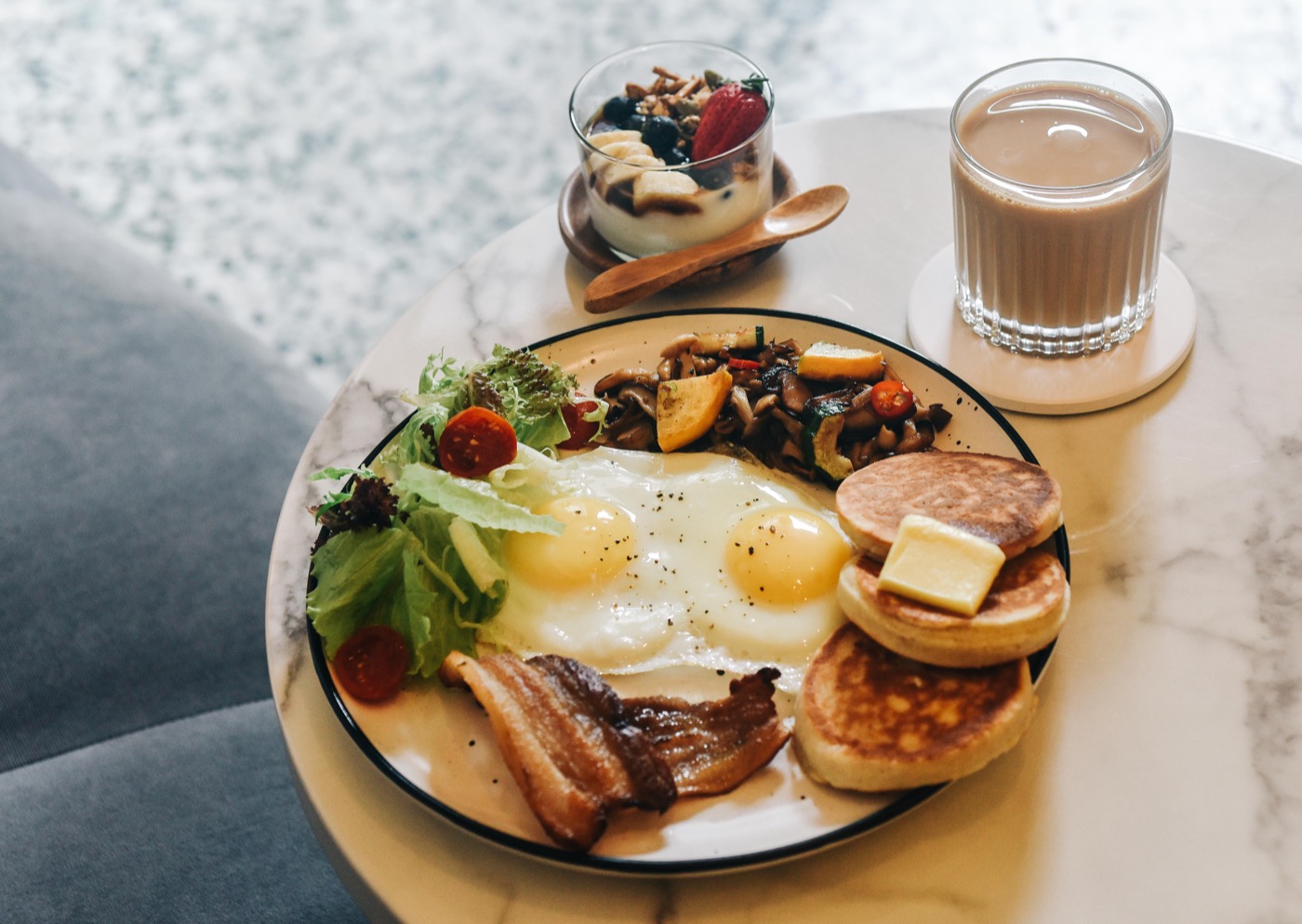 左為一樓魏斯咖啡廳白天提供的「R&C早午餐」,右為一樓晚餐料理「小卷黑米粉」。 (Photo Credit:榕 洋行)