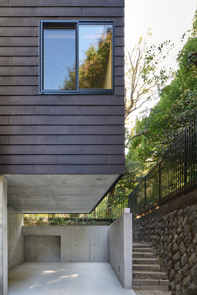 首先Torafu Architects將入口設於地下一樓,並採用鋼筋混凝土構造(RC)結合倒梁工法,以懸臂梁方式製造出懸浮感,不只巧妙引採光、通風入室,同時也提供一方停車場域解決基地原先難以停車的困境。此外,在一樓規劃上,刻意將高度略高於公園地面,使視線不至於被公園圍欄遮擋,而二樓則設置在可以看見樹冠枝葉茂密的水平位置,讓居家視野徹底被打開。
