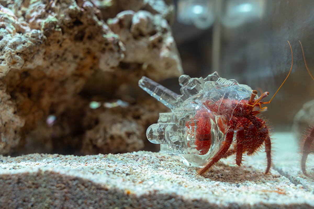 山展區|AKI INOMATA《為何不給寄居蟹一個避風港呢?》,作品以3D列印製作寄居蟹殼,造型取自世界城市建築,寄居蟹自由選擇進駐殼體的過程,象徵國籍、居所的轉換,也隱喻移民與難民議題。 (Photo Credit:2025基隆潮藝術/劉耀鈞 攝影)