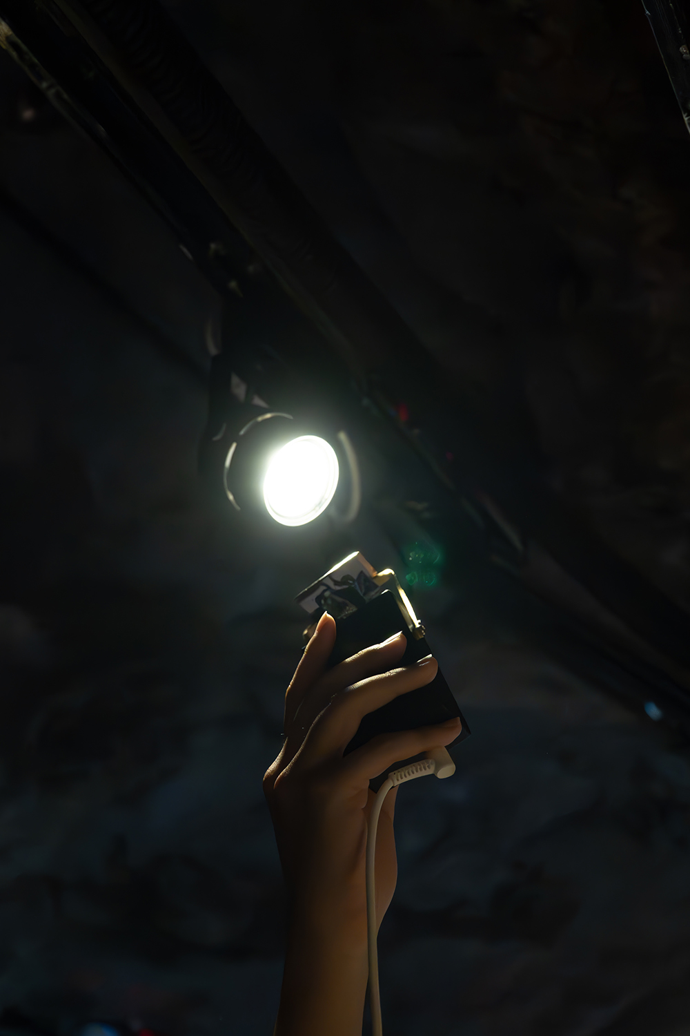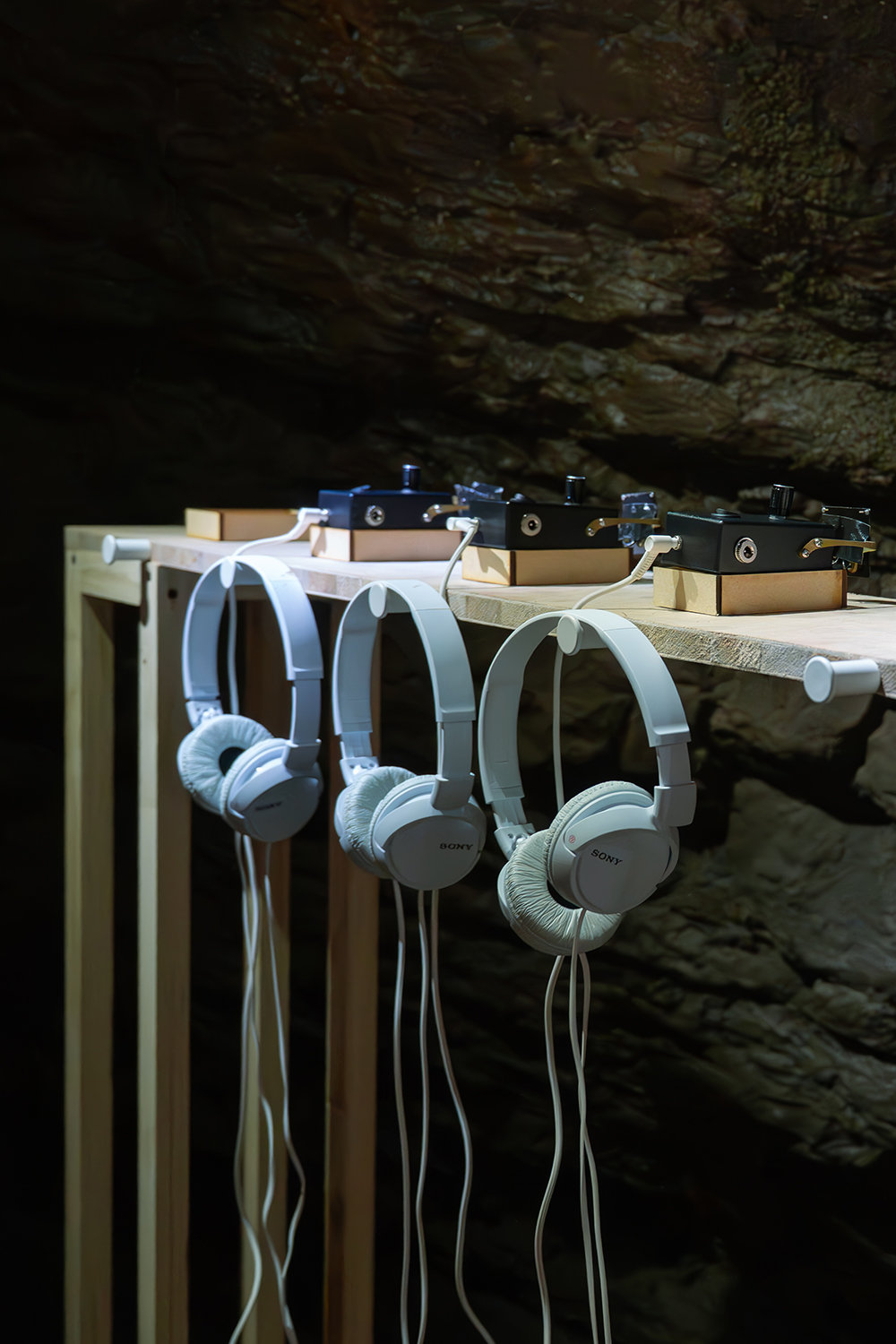 山展區|張欣語 《 Listen to the Light - Keelung ver. 》,作品將戰時洞穴經驗轉化為「聽光」的行動,透過聲音感測與燈光裝置,觀眾在洞穴裡戴上耳機聽見不同的光,重構防空洞中感知外界的獨特經驗。(Photo Credit:2025基隆潮藝術/劉耀鈞 攝影)
