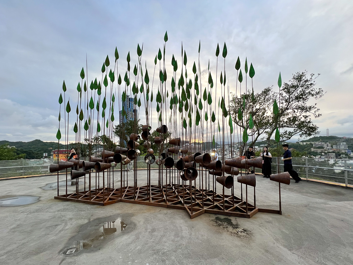 動力藝術家王仲堃則於基隆塔頂創作《隨風搖曳的聲物》聲音雕塑裝置,如植物般直立生長,當陣風吹來時,金屬桿與扇葉發出清脆聲音,號角狀構件也傳遞聲響,讓觀者在海風與作品之間感受地景、歷史與身體感知的交錯。