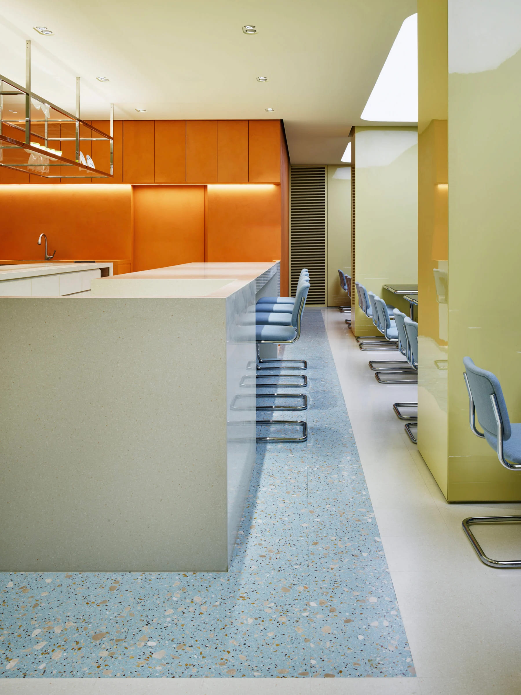 MARNI CAFE 在設計上大量運用柔和與鮮明色塊,營造出活潑卻舒適的氛圍,同時也可看到水磨石材質的吧檯、青綠色 Marcel Breuer 經典鋼管椅、大理石餐桌等元素的應用,除了增加了整體空間的層次,更呼應了品牌的材質混搭精神。當然,餐點的部分也不馬虎,MARNI CAFE 的甜點特別邀來東京甜點名店 PÂTISSERIE ASAKO IWAYANAGI 監製,推出以當季水果與層次感著稱的 「MARNI Parfait」。廚房與吧檯採開放式設計的應用,也使製作過程可以直接被看見,成為體驗的一環。