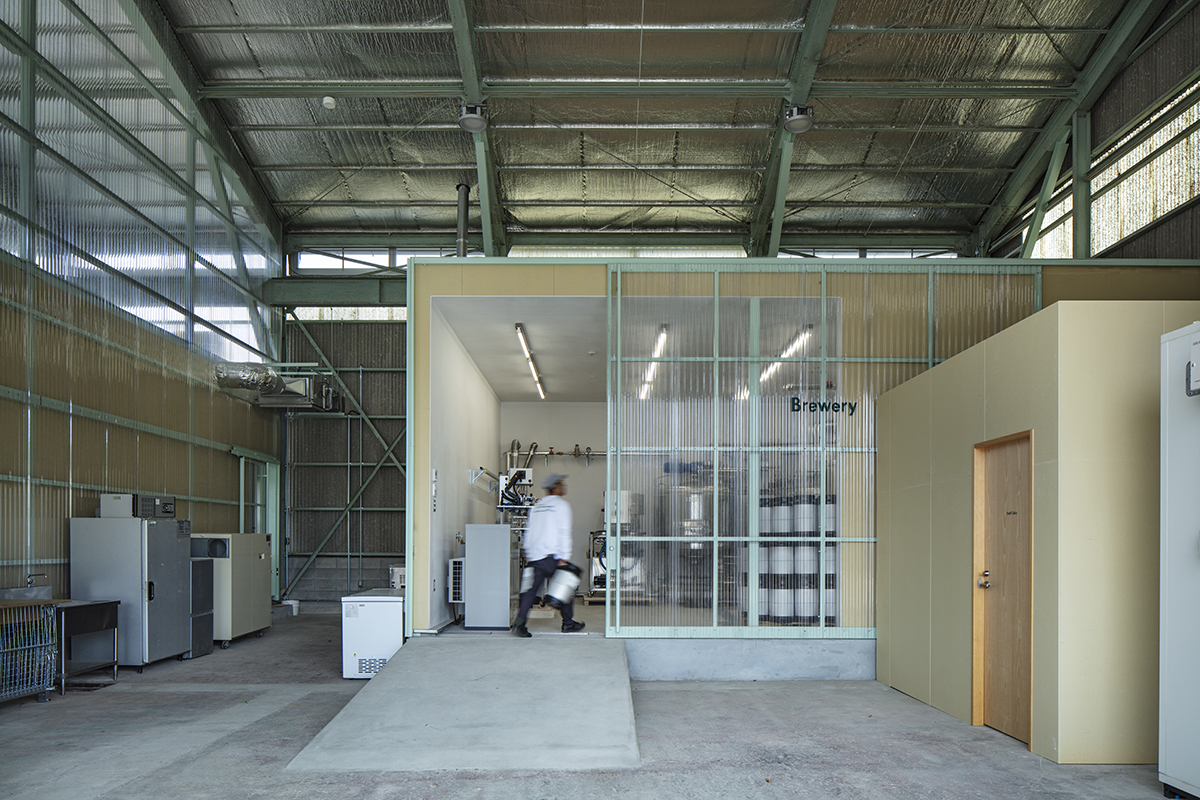 Amuse 邀請擅長轉化既有建築的長坂常擔綱設計,他保留了原有的工業粗獷感,並賦予空間新的生命。占地約 360 平方公尺的廠房被分為兩側:一邊延續工廠功能,成為釀酒廠;另一邊則轉化為對外開放的咖啡廳,兩側的入口各自置中且對稱,讓建築呈現一種「雙胞胎」般的姿態。設計細節上,舊有的石綿瓦屋頂被保留,釀酒廠側也保留原本的金屬板外牆以確保遮光;咖啡廳側則換上波浪狀的 PC 板外牆,引入自然光線,讓戶外經過的路人能窺見內部活動,營造親切而開放的氛圍。