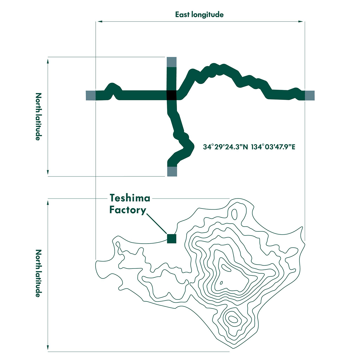 建築外牆上印著的品牌視覺識別,由日本 6D 設計事務所的木住野彰悟設計,他以豐島的地形切面為靈感,線條交會處標示出 Teshima Factory 的所在,綠色線條象徵山與田地,水藍色則代表瀨戶內海,簡潔的圖像不僅融入工業風格的場域,也讓人一眼看出這是屬於豐島的符號。