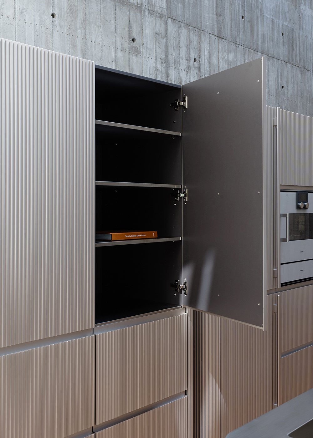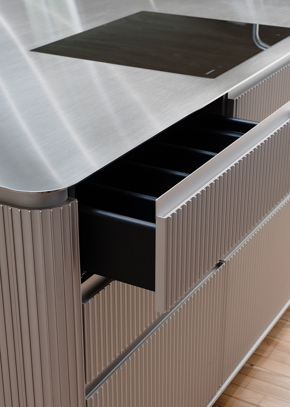 V3 Kitchen 優雅離地的銀灰鋁櫃體與圓潤轉角的彎曲線條,展現堅實卻輕盈的美感,細節上更延續 Vipp 一貫的低調語彙:櫥櫃抽屜配備高規格 Blum 五金零件,門片以隱藏式把手呈現內斂氣質;高櫃冰箱則配置外顯長把手,確保能承受厚重櫃門的開闔壓力。每個單位櫃體上方都懸浮著 4 公釐厚、一體成型的不鏽鋼檯面,結合俐落與耐用,傳達「工具美學 Tools for living」的核心精神。