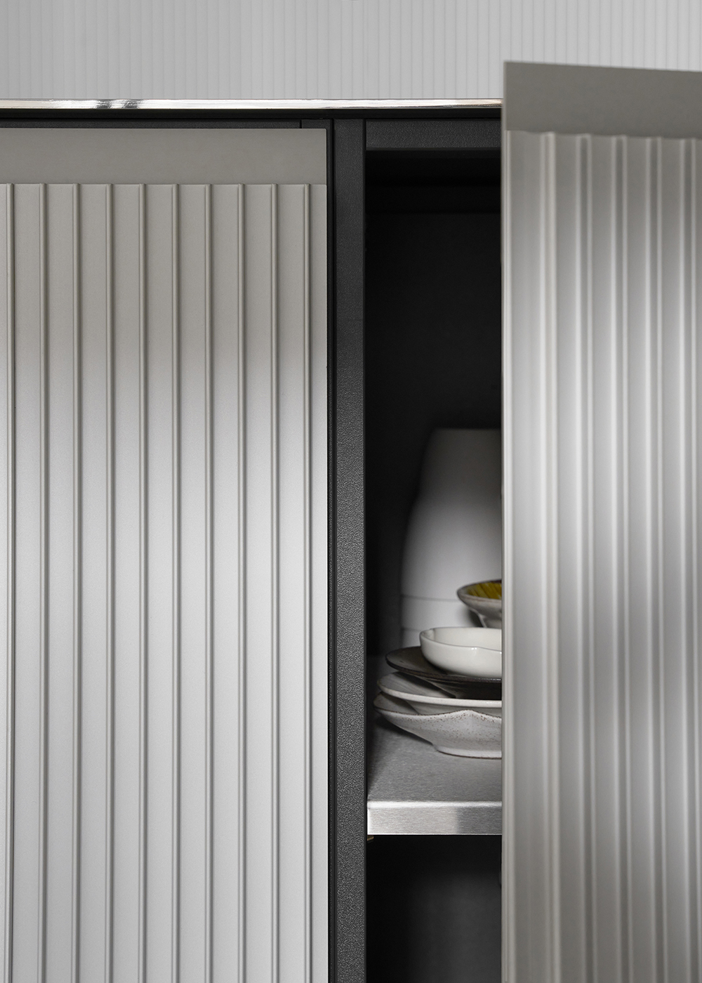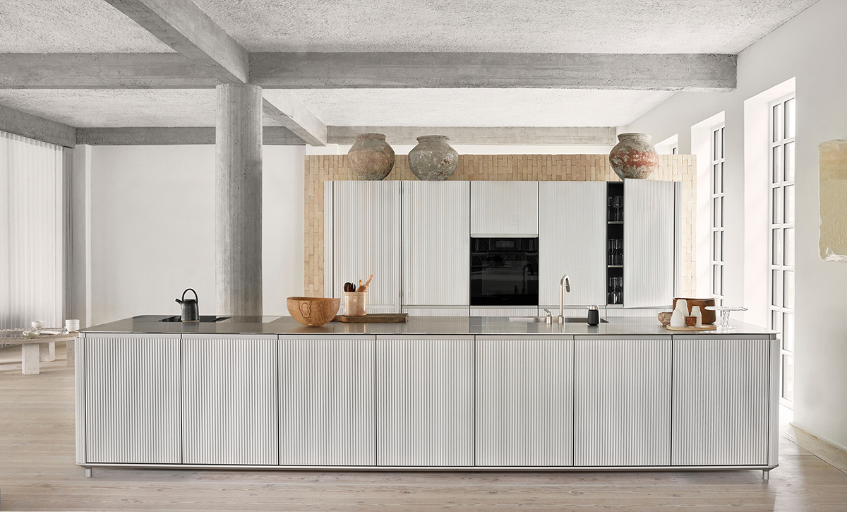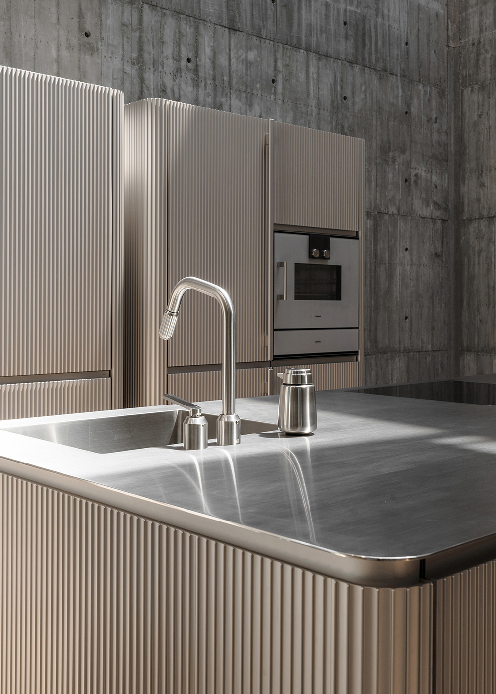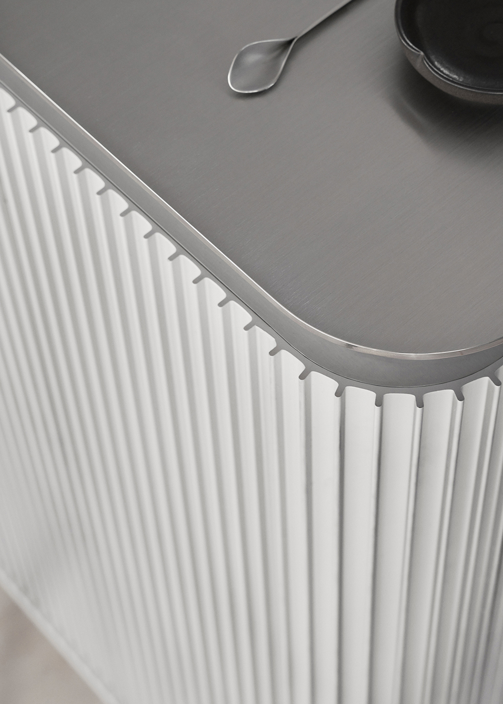 丹麥設計品牌 Vipp 近期推出了全新的廚房系列「V3 Kitchen」,以陽極氧化銀灰鋁材質打造,表面經過特殊壓製工法,呈現租波浪直條紋的細膩紋理。當光線游移於弧度之上,櫃體彷彿散發著輕盈的銀色光澤,為日常廚房帶來明亮而舒適的氛圍。