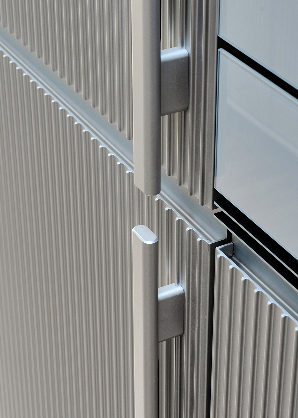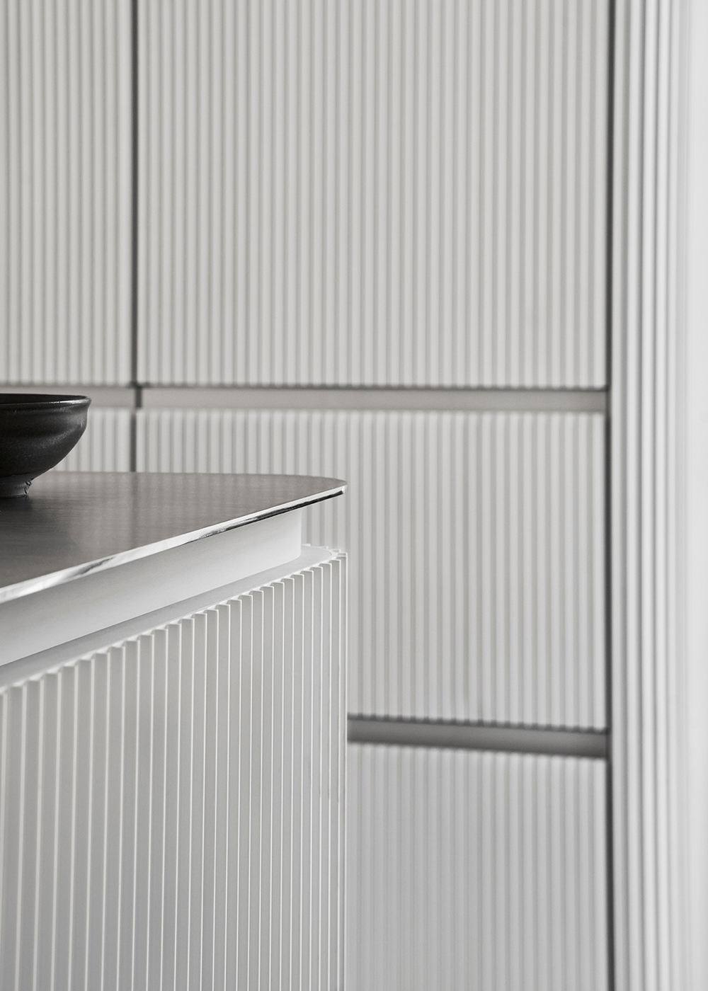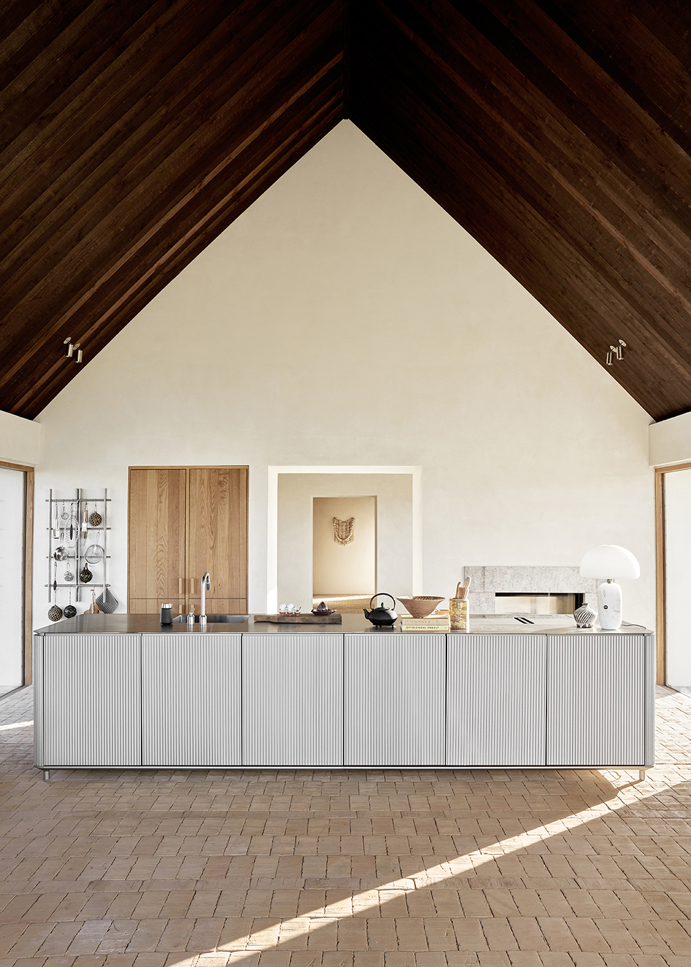 丹麥設計品牌 Vipp 近期推出了全新的廚房系列「V3 Kitchen」,以陽極氧化銀灰鋁材質打造,表面經過特殊壓製工法,呈現租波浪直條紋的細膩紋理。當光線游移於弧度之上,櫃體彷彿散發著輕盈的銀色光澤,為日常廚房帶來明亮而舒適的氛圍。