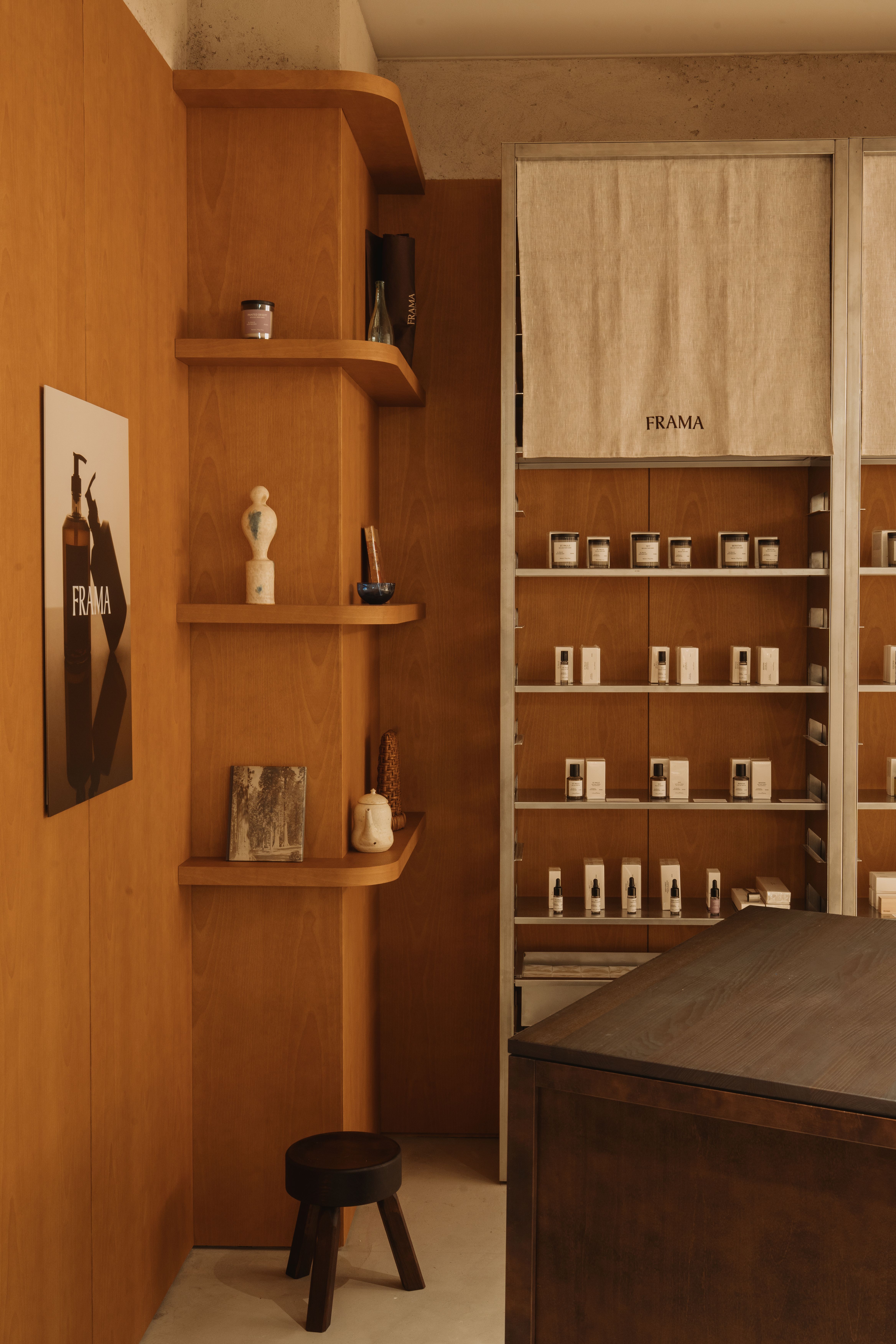 店鋪內共三面牆皆覆以不鏽鋼層架,空間特別選用當地的檜木與杉木作為牆面與櫃檯主要材質,並透過木質與鋼材的對比,增添感官上的層次與趣味。高挑的鋼架頂部搭配編織布簾,與順勢轉角的內嵌木層板形成對比,營造自然有機的流動感。為了讓空間更具親近、生活感,FRAMA 選擇以小雕塑與生活器物裝飾的陳列,呼應品牌在室內設計上的實驗精神。