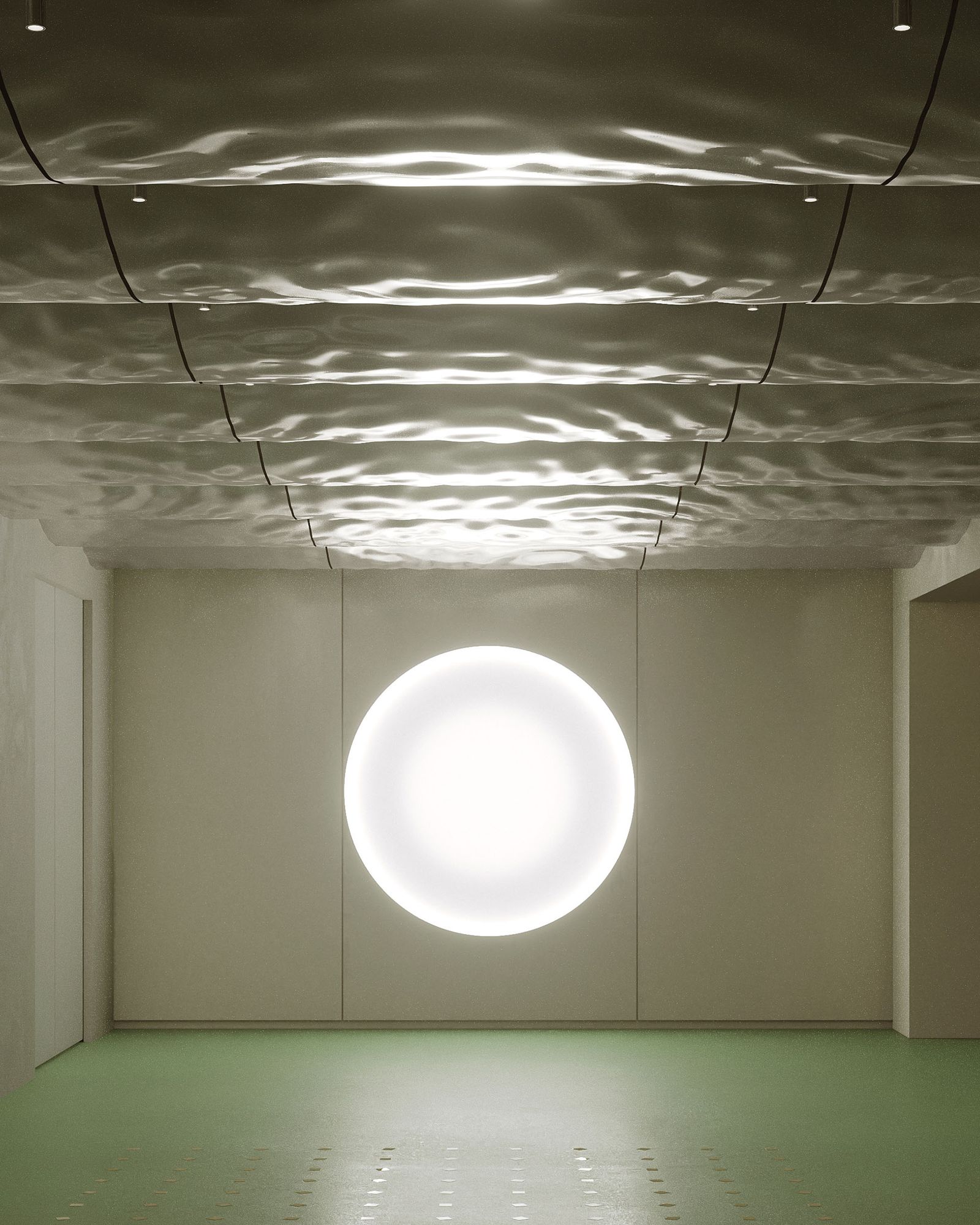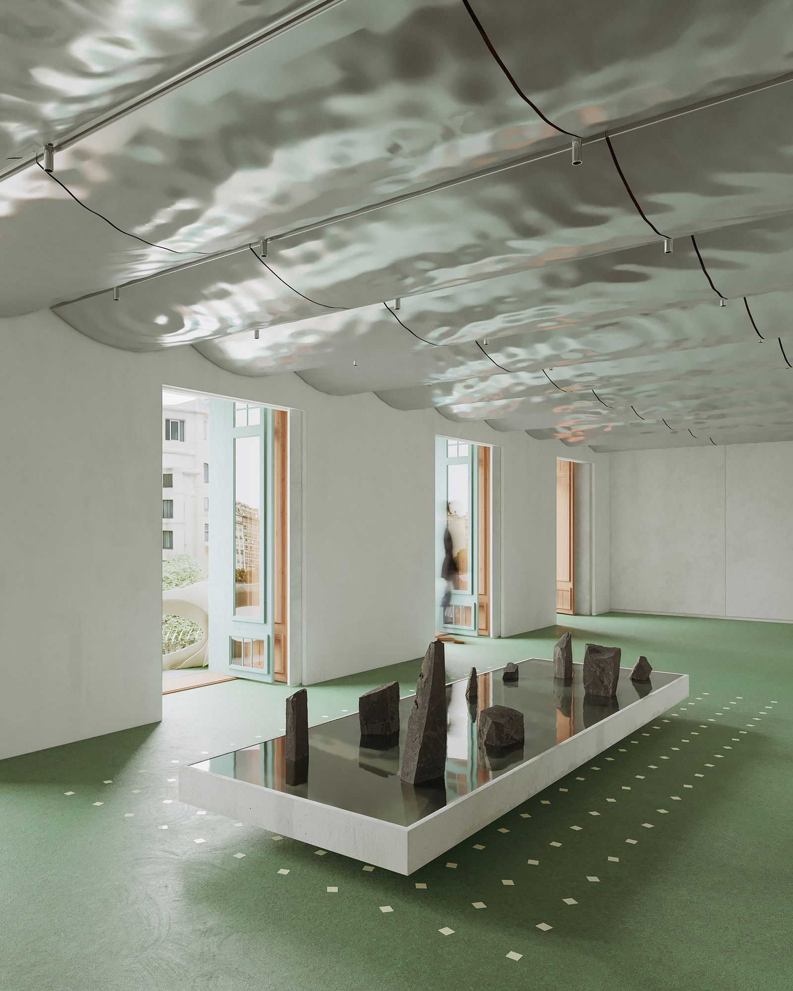 Mesura 將原本的住宅二樓轉化為畫廊,過程中保留了木作、彩色玻璃等歷史細節,同時引入曲面金屬天花板,絲網印製同心波紋,既提供結構支撐,也呼應水面漣漪般的細膩律動。Mesura 合夥人 Carlos Dimas 表示:「我們希望創造一種回聲,一種低語,增添高第的宇宙而不改變它。」