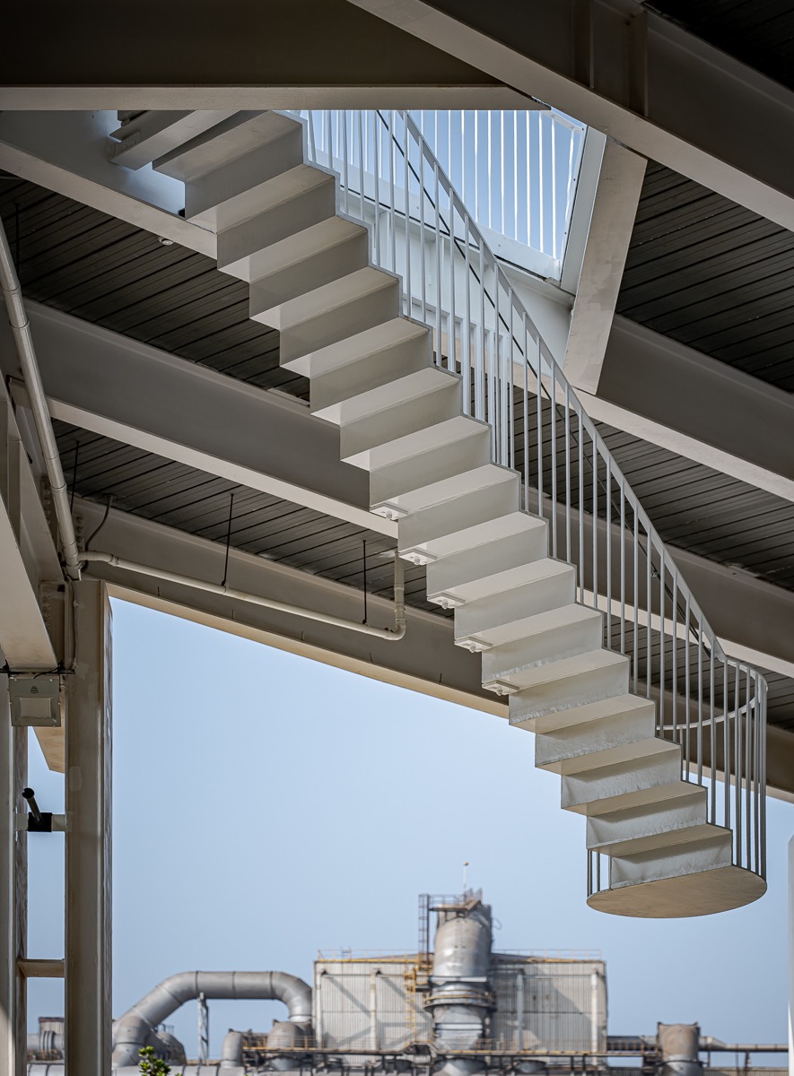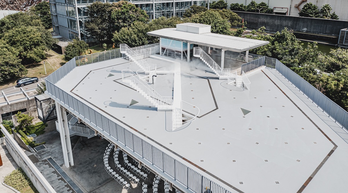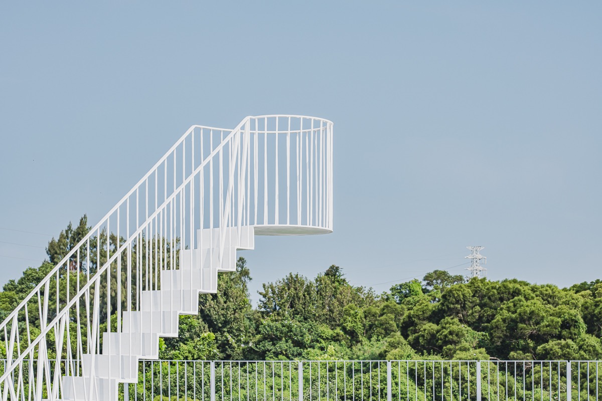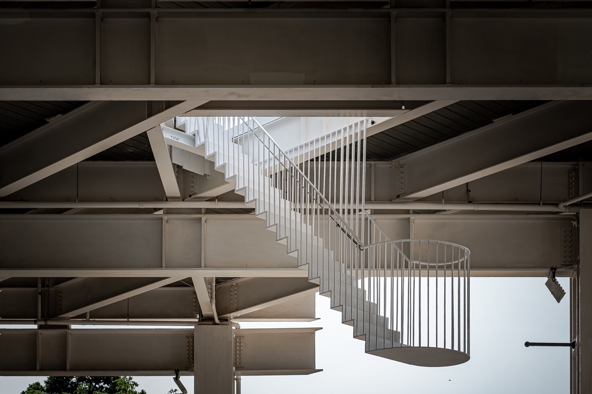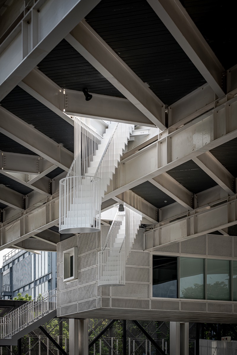 本屆作品由大尺建築操刀設計。團隊在離地十公尺的平台上開了三個天窗,植入三組鋼構作品。它們既是雕塑,也是能被攀登、凝視、體驗的小建築。鋼鐵不再隱於建築內部,而是以結構之美大方展現於外:每一道階梯、每一個扶手的比例與厚度,皆因結構需求而生,也因此處處可觀。